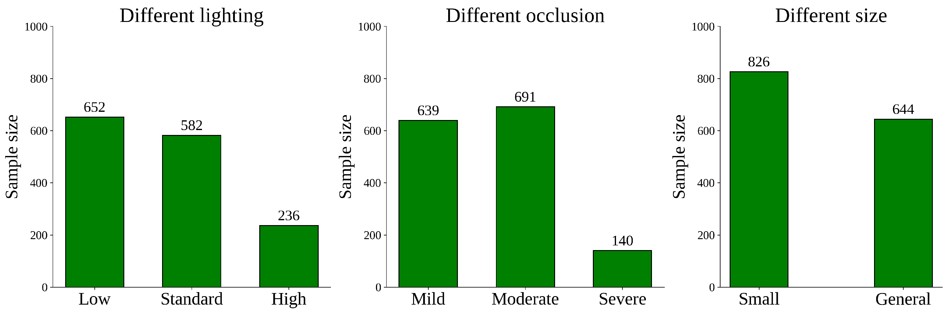The dominance of small objects in the dataset highlights the importance of testing different object sizes in practical scenarios. As shown in
