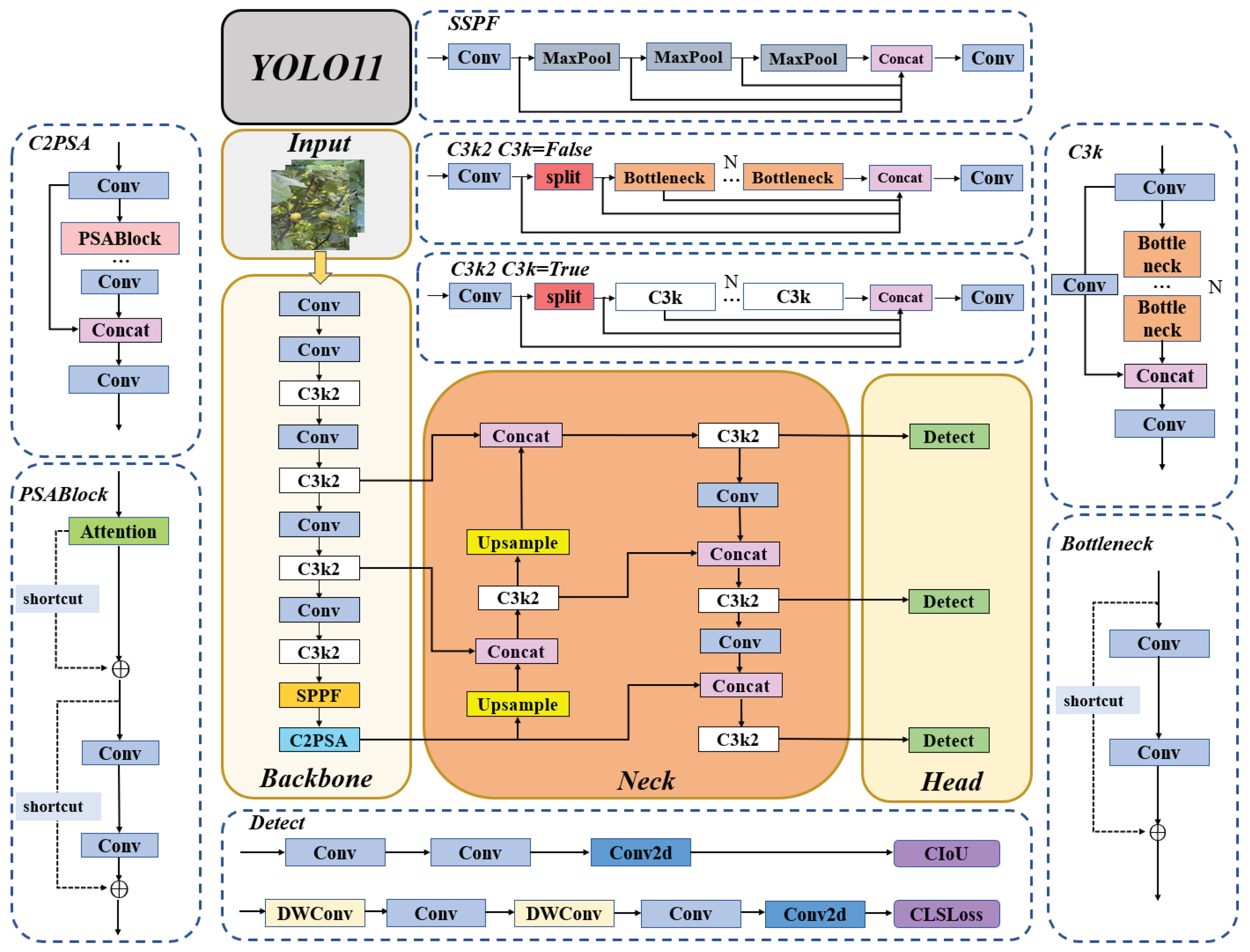 YOLOv11 improves feature extraction while maintaining computational efficiency by introducing the enhanced C3k2 block, SPPF module, and C2PSA component, as illustrated in