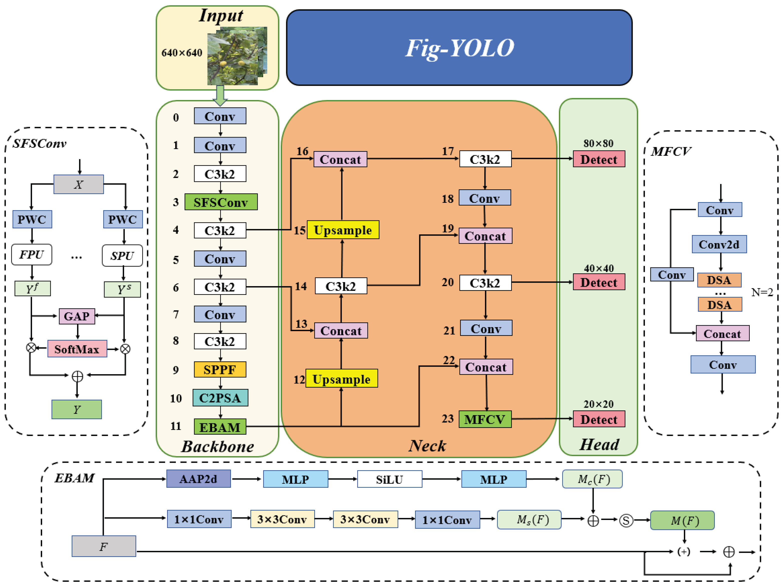 To achieve efficient fig detection in complex environments, we propose a new model, Fig-YOLO, based on the YOLOv11n architecture, as shown in