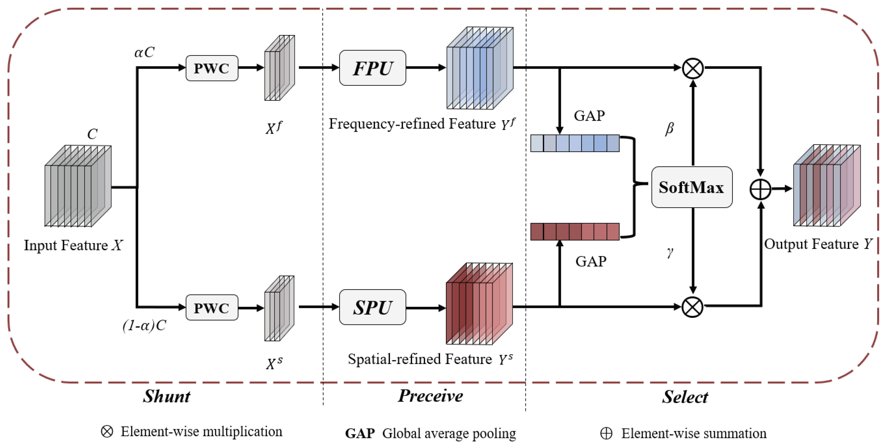The SFSConv module first divides the input feature map into spatial and frequency components by a scaling factor . The spatial part, denoted as , represents spatial features and provides spatial information. The frequency part, denoted as , captures frequency characteristics. Next, two separate pointwise convolutions (PWCs) are applied to and to adjust the features, enhancing their compatibility for subsequent feature extraction in the spatial and frequency domains.