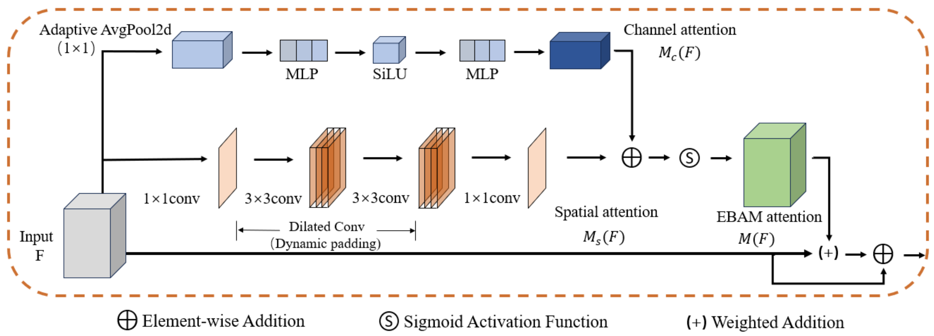 Figure 7. This module optimizes BAM, making it more effective at extracting key features of figs and suppressing occlusion interference. In terms of channel attention, EBAM replaces the traditional ReLU activation with SiLU, introducing a smoother nonlinear mapping that improves sensitivity to subtle differences in fruits. Additionally, the single-layer fully connected structure is expanded into a multi-layer perceptron (MLP), providing more flexibility in modeling channel dependencies. To avoid instability during small-batch training, the BatchNorm layer is removed, ensuring the robustness of the training process. In terms of spatial attention, EBAM introduces dynamic padding and configurable dilated convolutions, enabling the model to capture a larger receptive field and strengthen context modeling capabilities, addressing issues like branch and leaf occlusion. Furthermore, the channel branch adopts adaptive pooling instead of global average pooling with a fixed kernel size, eliminating dependence on the input feature map size and ensuring consistent multi-scale feature compression.