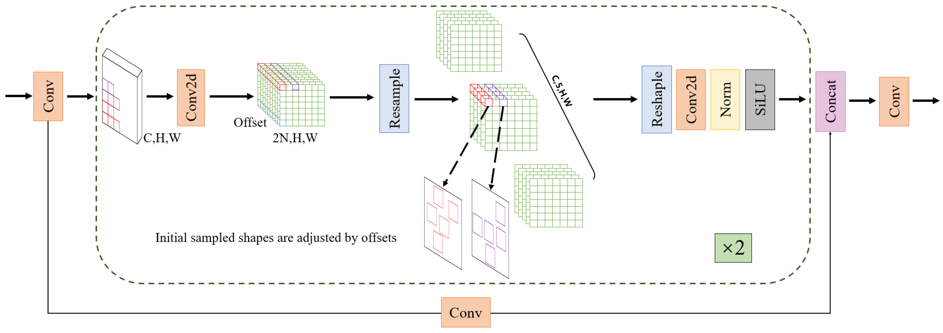 The convolution operation under the dynamic sampling mechanism proceeds as follows. For each convolution sampling position , the module first predicts the offset based on the network’s output, generating the dynamic sampling point . Then, the weights of the convolution kernel W are applied to the offset sampling points. The convolution results from all sampling positions are summed, producing the output feature for that position.