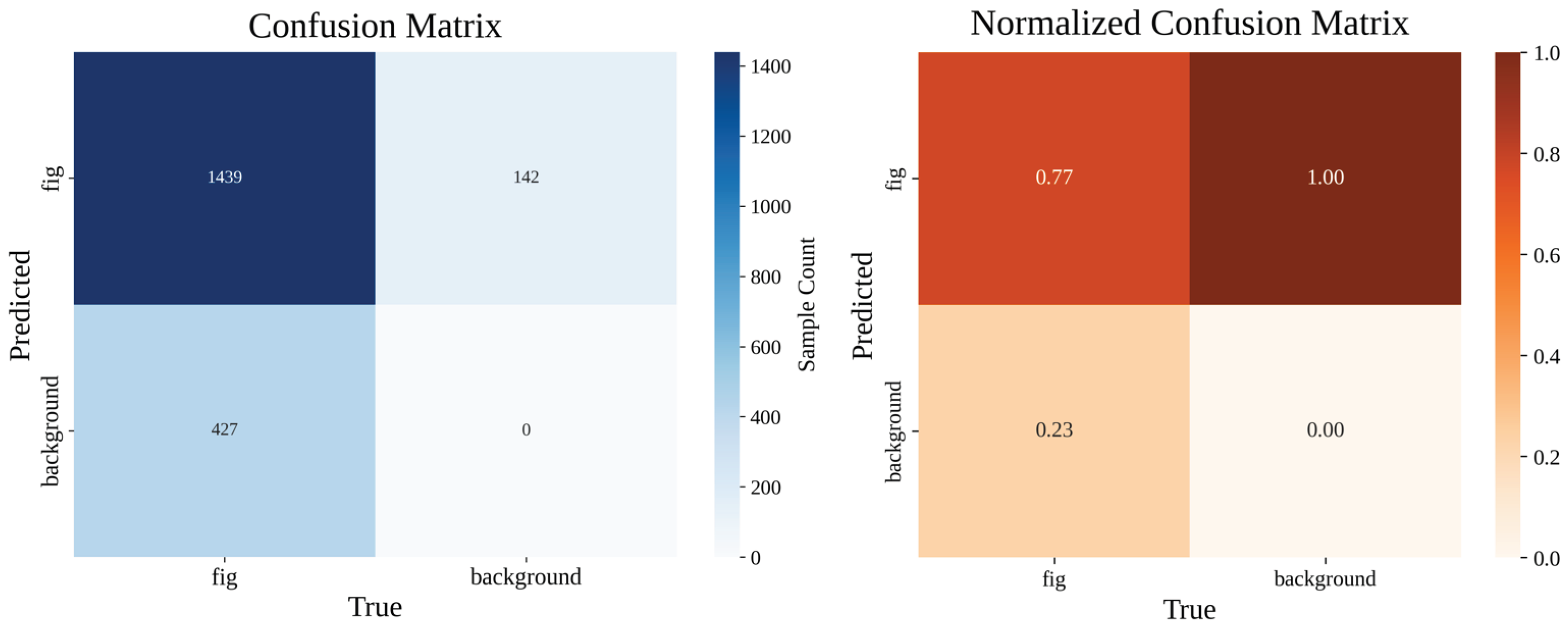 Figure 10. The left panel presents the confusion matrix, illustrating the distribution of predicted sample counts for figs and background in the test set, while the right panel shows the normalized confusion matrix, representing the prediction probabilities for each class. Compared to YOLOv11, Fig-YOLO shows improvements in both precision and recall, indicating its stronger detection capability in complex backgrounds and dense fruit environments. While YOLOv10 and YOLOv8 perform well in mAP@0.5, they still fall short of Fig-YOLO in precision, recall, and F1 score.