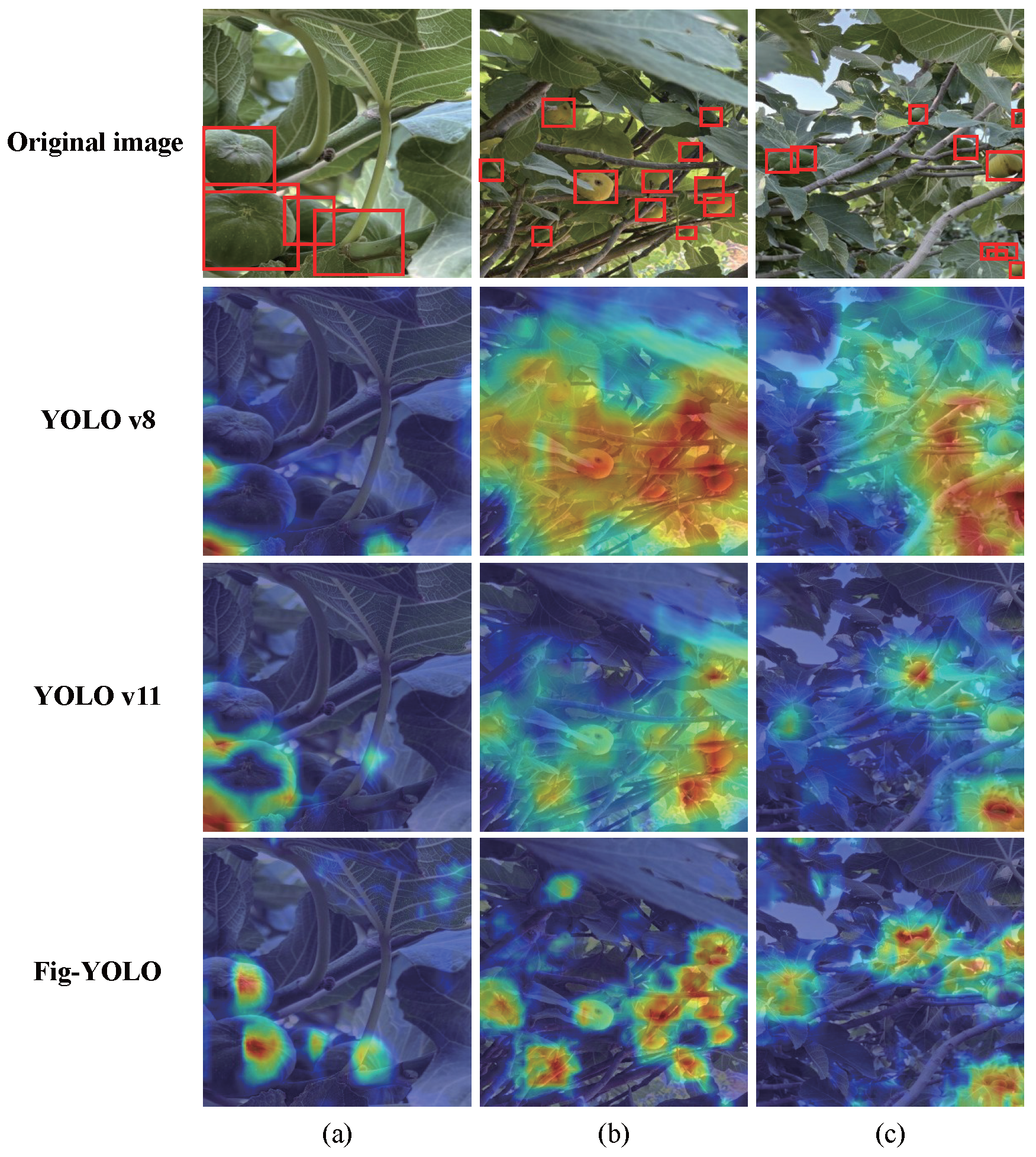 Figure 11b, the YOLOv8 heatmap is very scattered and struggles to capture features of dispersed and occluded fruits, while the YOLOv11 heatmap exhibits similar issues. In comparison, the Fig-YOLO heatmap is denser and can accurately focus on the fruit region, even when the fruit is occluded or unevenly distributed, allowing for better identification and feature emphasis. In