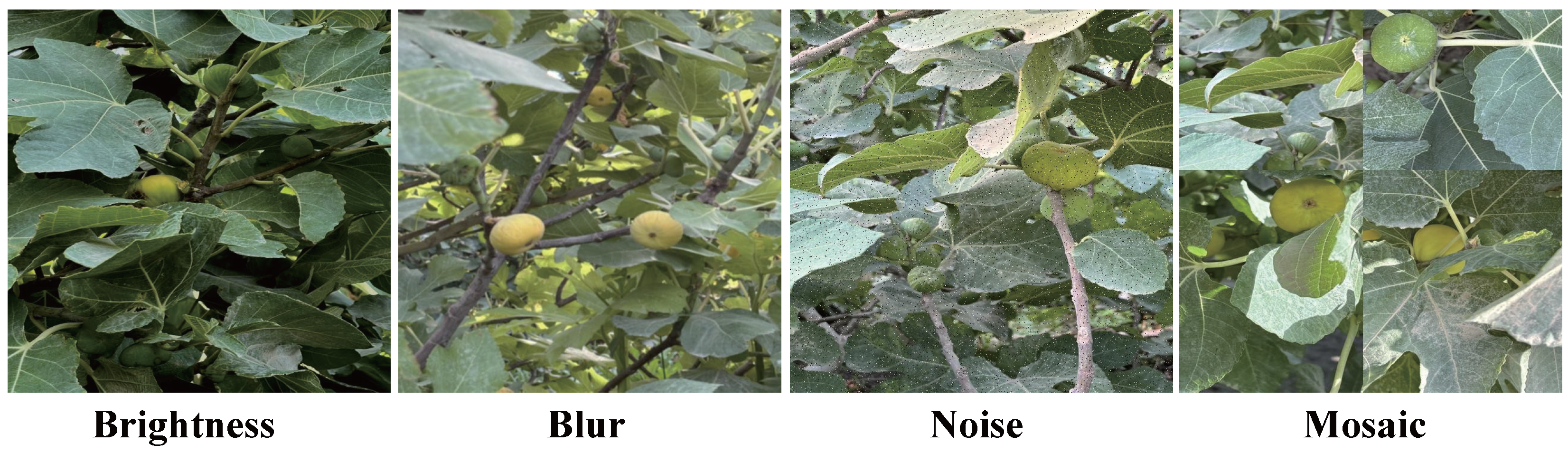 The fig variety used was the Xinjiang Early Yellow. The identification and verification of fig fruits were performed by trained orchard staff to ensure annotation accuracy, while non-fruit parts that were not collected are not included in the dataset. The images focus on individual fruits rather than branches or entire trees, providing clear examples for accurate fruit recognition. Data collection was conducted in early October 2024 and mid-July 2025, yielding a total of 1015 raw images in 2024 and 1861 raw images in 2025. During the data preprocessing stage, all images were carefully screened, and those that were blurry, overexposed, or exhibited obvious compression artifacts were removed. 950 and 1470 usable images were obtained at the Fig Ecological Garden and the Jinjiamu Orchard, respectively, resulting in a total of 26,315 fig samples. Through this procedure, we minimized the impact of compression artifacts inherent in high-resolution JPG images and ensured the clarity and usability of the training data. The collection process took into account diverse real production scenarios, as illustrated in