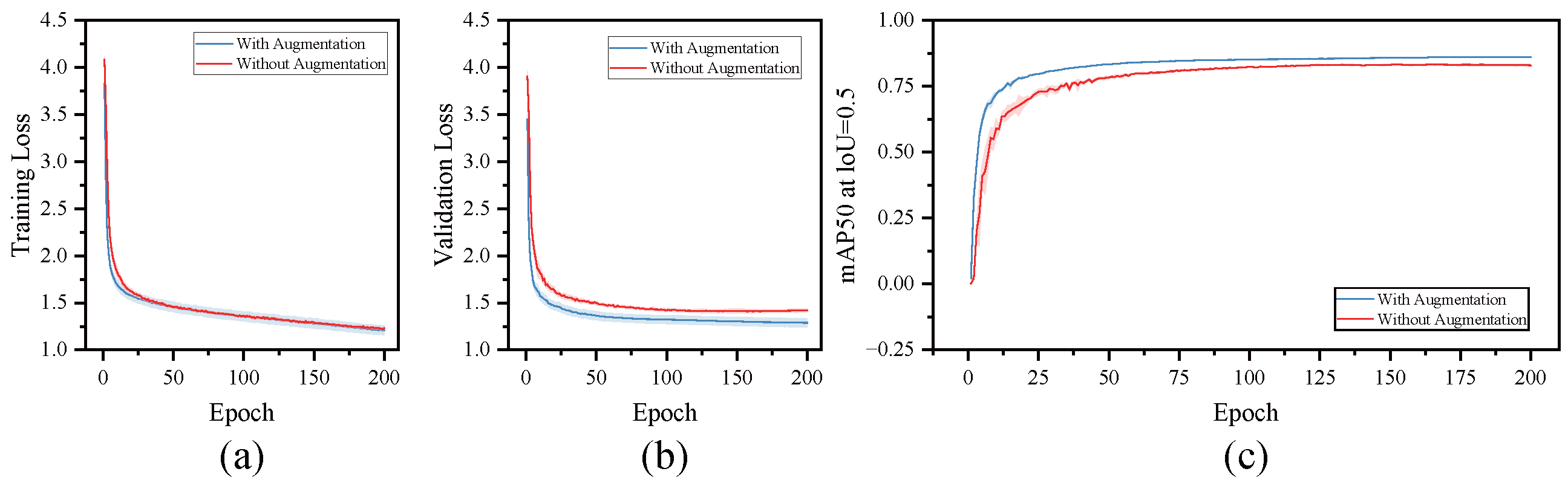 To further analyze the impact of the data augmentation strategy on the model’s training process, this study plotted the training loss, validation loss, and mAP@0.5 curves, with shaded areas representing the variability across independent runs using different random seeds, as shown in