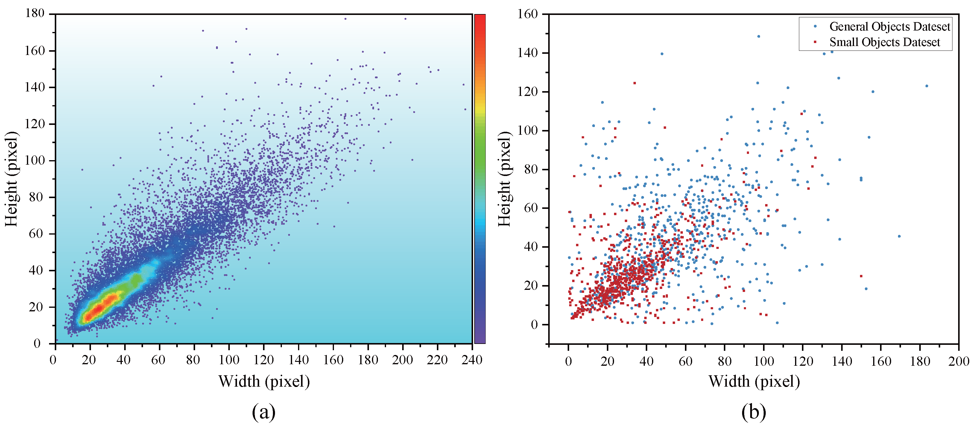 Figure 14a presents the pixel distribution of target width and height in the dataset, with color intensity indicating the target density. It is evident that small objects occupy a larger proportion and are concentrated within smaller pixel ranges.