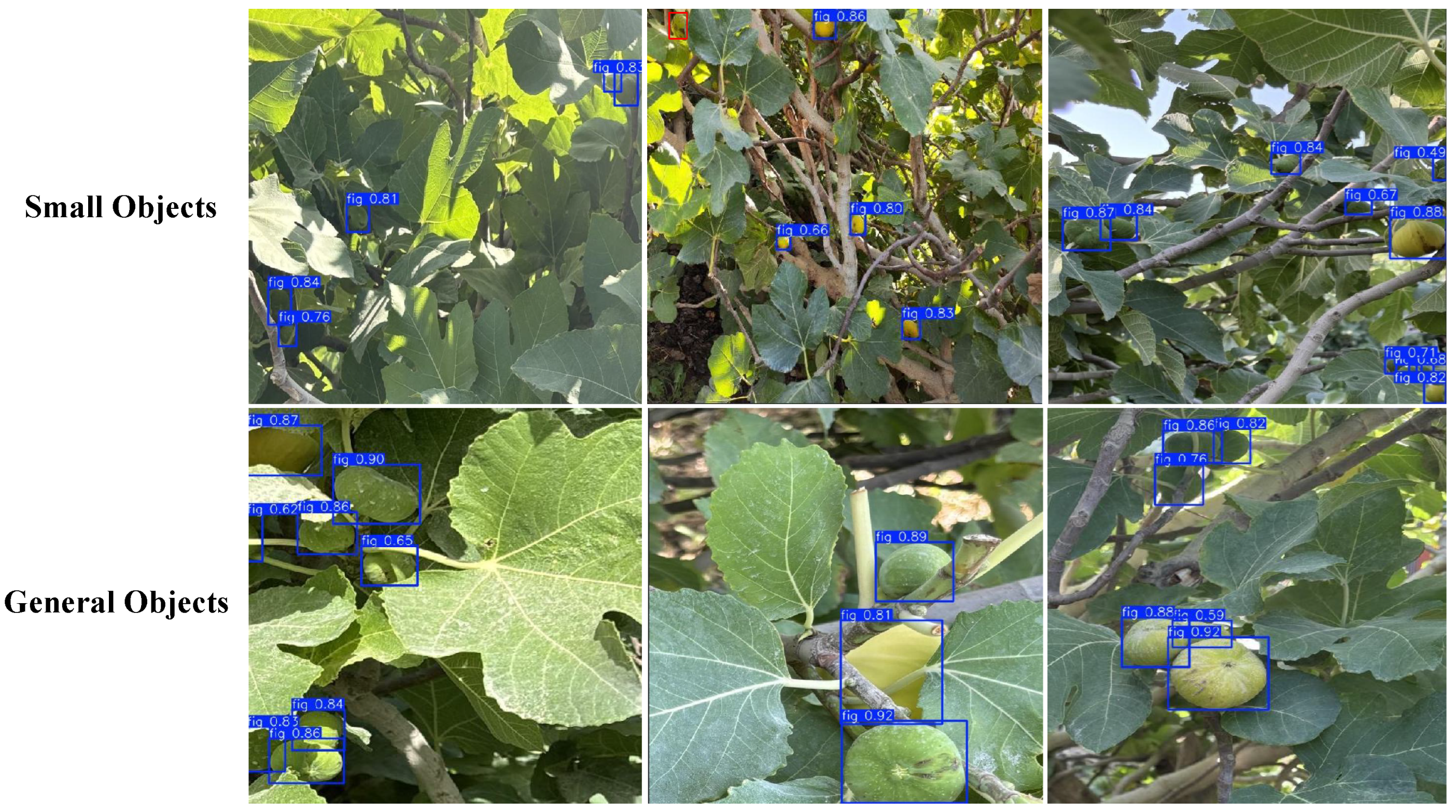 Table 1. To further evaluate the model, this study incorporates fig images from publicly available international datasets. These images cover different varieties, acquisition conditions, and background environments, enabling an assessment of Fig-YOLO’s performance across regions and data sources. A systematic analysis of detection results under varying fruit sizes, occlusion levels, lighting conditions, and data sources facilitates a comprehensive evaluation of the model’s stability and adaptability in complex environments.