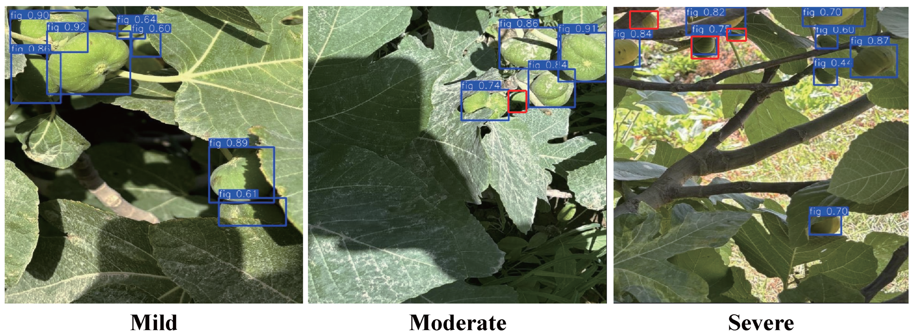 Under different occlusion conditions, the model’s recognition results align with the performance data. In the mild occlusion, the model performed best, with a P of 91.0%, R of 80.2%, mAP@0.5 of 87.8%, and an F1 of 85.3%. The majority of the fruits were accurately detected, with high confidence scores and nearly complete detection. As the occlusion degree increased, the performance slightly declined. Under moderate occlusion, the recall dropped to 79.1%, but Fig-YOLO still maintained good detection performance (mAP@0.5 of 87.0%). In the case of heavy occlusion, the model performance decreased most significantly, with mAP@0.5 dropping to 78.9%. Some heavily occluded fig fruits were not detected by the model (indicated by red boxes). The figure shows that these fruits grow in clusters and are extensively occluded by leaves and branches. This visual example demonstrates that severe occlusion leads to the loss of fruit boundaries and texture features, thereby reducing the model’s ability to correctly identify these fruits and resulting in missed detections. In contrast, for partially visible or lightly occluded fruits (indicated by blue boxes), the model is still able to detect them successfully, indicating relatively stable recognition performance under complex occlusion conditions. This visual analysis clearly illustrates the limitations of the model under extreme occlusion scenarios.