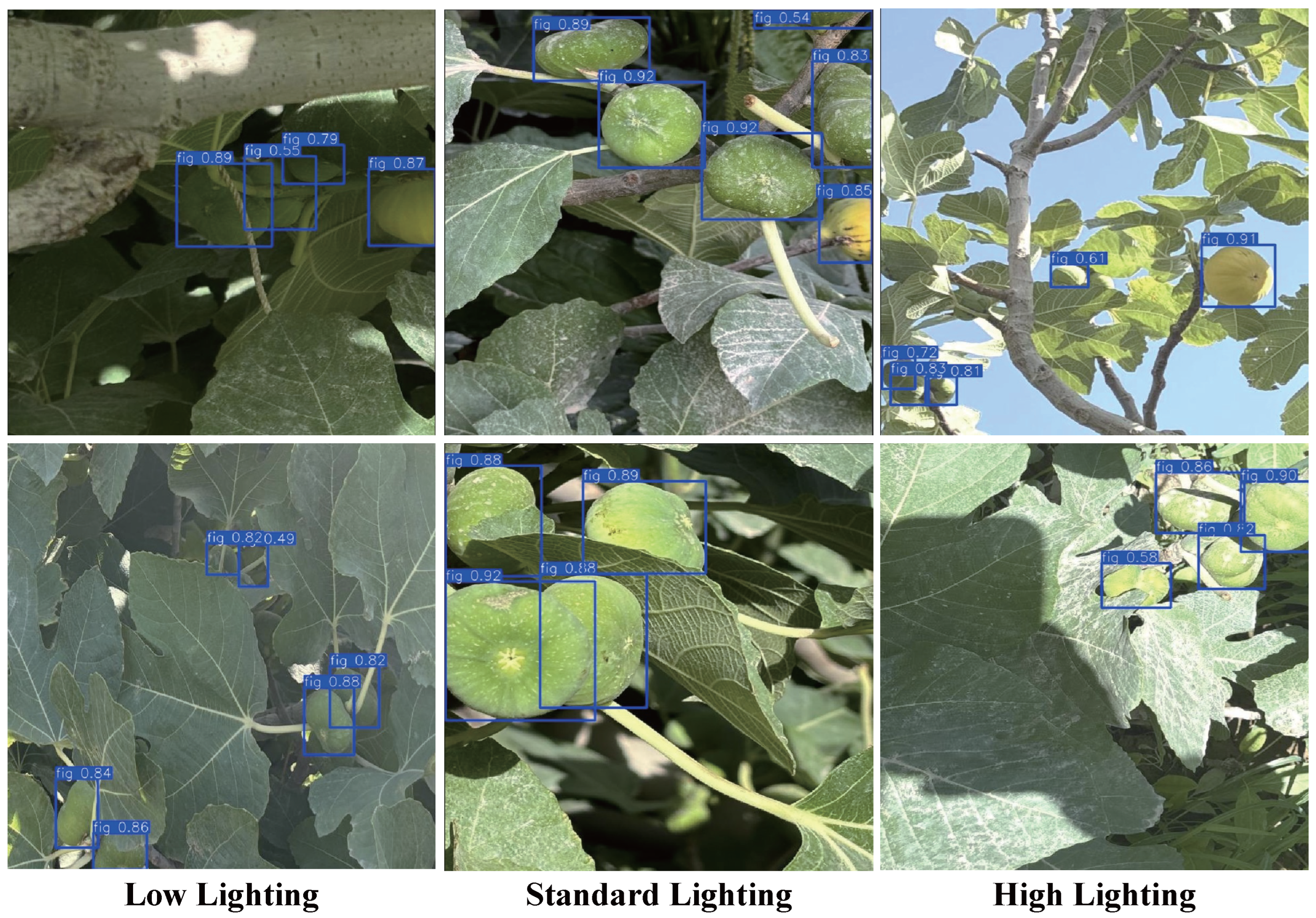 This study further evaluates the performance of the Fig-YOLO model under various lighting conditions, including standard lighting (daylight), low light (simulating dusk/cloudy scenes), and high light (direct strong sunlight). As shown in