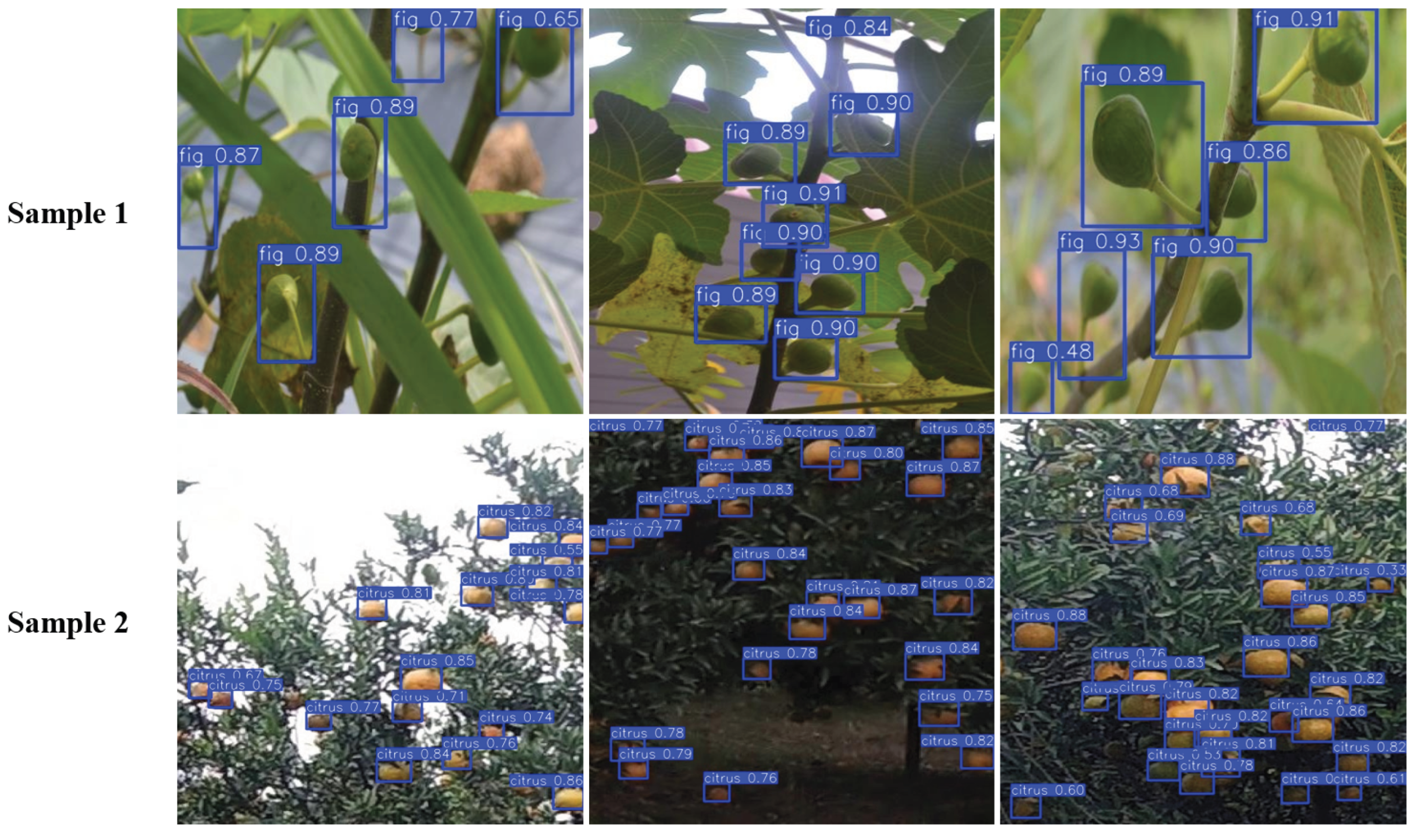 To further evaluate the model’s adaptability across different regions and varieties, two different types of external samples were selected for validation: images of fig fruits from other regions and varieties (Sample 1, from the Roboflow fig-fruit_dataset) and images of a different fruit type, citrus (Sample 2, from the Roboflow citrus-kepw7_dataset). The validation results are summarized in