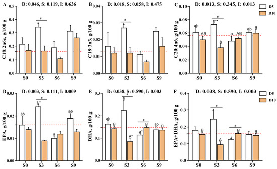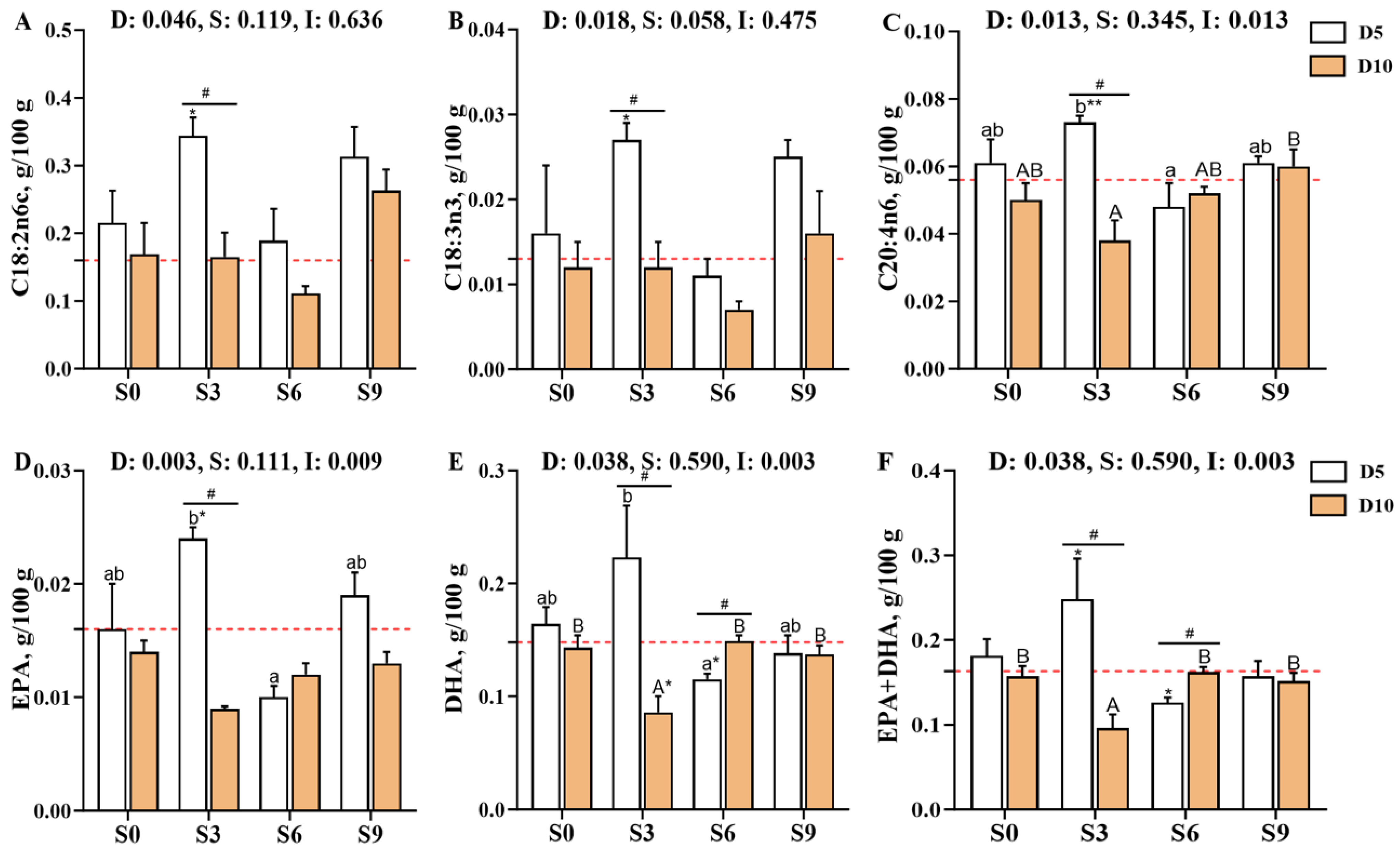 Effects of short-term depuration under saline conditions on muscle fatty acid composition in Carassius auratus gibelio. (A), C18:2n6c content in muscle; (B), C18:3n3 content in muscle; (C), C20:4n6 content in muscle; (D), C20:5n3 (EPA) content in muscle; (E), C22:6n3 (DHA) content in muscle; (F), Sum content of EPA+DHA in muscle. The red dashed line indicates the baseline values of muscle nutritional composition measured before depuration (D0S0 group). “*” and “**” denote significant and highly significant differences between each depuration treatment group and the D0S0 group (independent samples t-test, p < 0.05 and p < 0.01, respectively). “#” denotes significant differences among groups subjected to different depuration durations under the same salinity conditions (Independent samples t-test, p < 0.05). Different lowercase superscript letters indicate significant differences among salinity groups (S0, S3, S6, and S9) after 5 days of depuration (D5) (Tukey’s test, p < 0.05), while different uppercase superscript letters indicate significant differences among salinity groups (S0, S3, S6, S9) after 10 days of depuration (D10) (Tukey’s test, p < 0.05).