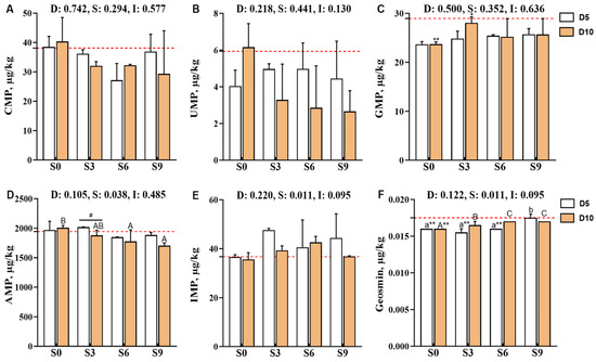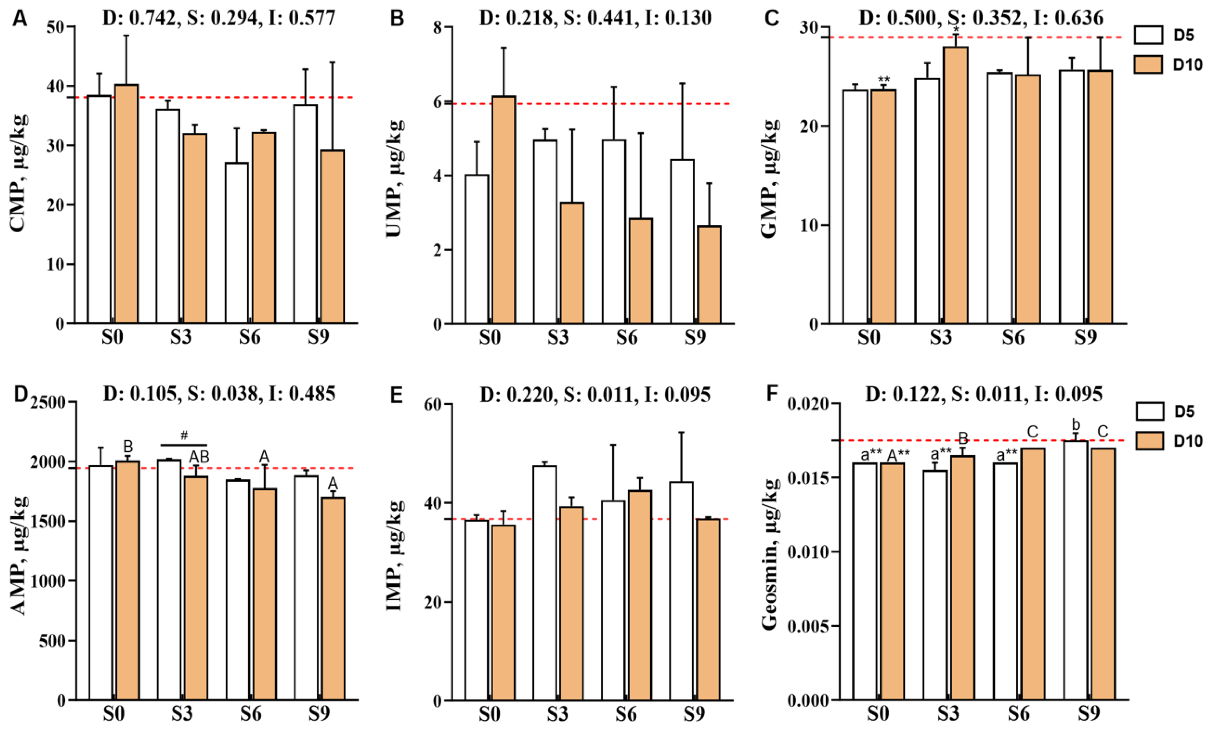 Effects of short-term depuration under saline conditions on the muscle content of flavor-related nucleotides and geosmin in Carassius auratus gibelio. (A), Cytidine monophosphate (CMP) content in muscle; (B), Uridine monophosphate (UMP) content in muscle; (C), Guanosine monophosphate (GMP) content in muscle; (D), Adenosine monophosphate (AMP) content in muscle; (E), Inosine monophosphate (IMP) content in muscle; (F), Geosmin content in muscle. The red dashed line indicates the baseline values of muscle nutritional composition measured before depuration (D0S0 group). “*” and “**” denote significant and highly significant differences between each depuration treatment group and the D0S0 group (independent samples t-test, p < 0.05 and p < 0.01, respectively). “#” denotes significant differences among groups subjected to different depuration durations under the same salinity conditions (Independent samples t-test, p < 0.05). Different lowercase superscript letters indicate significant differences among salinity groups (S0, S3, S6, and S9) after 5 days of depuration (D5) (Tukey’s test, p < 0.05), while different uppercase superscript letters indicate significant differences among salinity groups (S0, S3, S6, S9) after 10 days of depuration (D10) (Tukey’s test, p < 0.05).