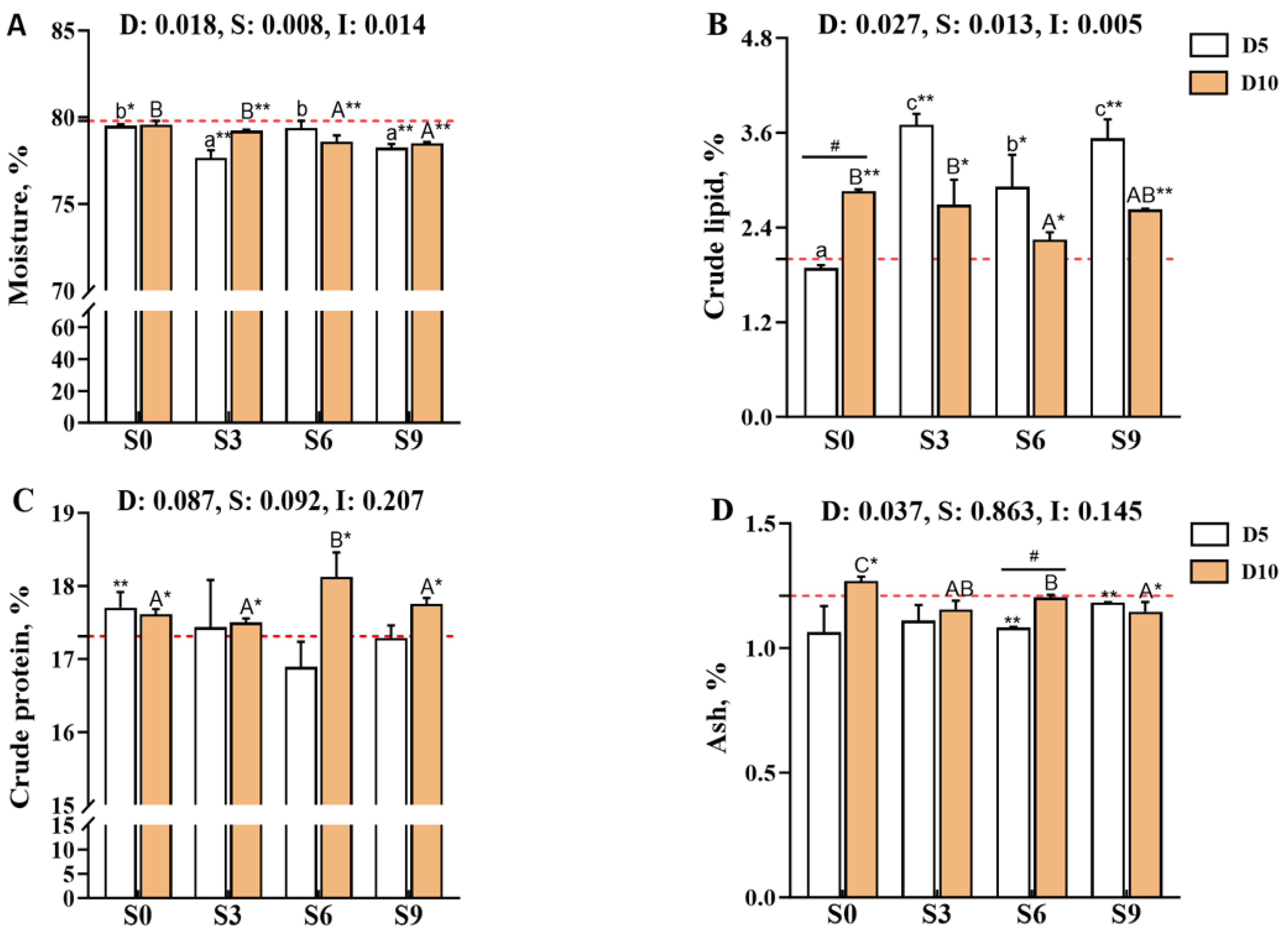 Effects of short-term depuration under saline conditions on muscle nutritional composition in Carassius auratus gibelio. (A), Moisture content in muscle; (B), Crude lipid content in muscle; (C), Crude protein content in muscle; (D), Ash content in muscle. The red dashed line indicates the baseline values of muscle nutritional composition measured before depuration (D0S0 group). “*” and “**” denote significant and highly significant differences between each depuration treatment group and the D0S0 group (independent samples t-test, p < 0.05 and p < 0.01, respectively). “#” denotes significant differences among groups subjected to different depuration durations under the same salinity conditions (Independent samples t-test, p < 0.05 and p < 0.01, respectively). Different lowercase superscript letters indicate significant differences among salinity groups (S0, S3, S6, and S9) after 5 days of depuration (D5) (Tukey’s test, p < 0.05), while different uppercase superscript letters indicate significant differences among salinity groups (S0, S3, S6, S9) after 10 days of depuration (D10) (Tukey’s test, p < 0.05).