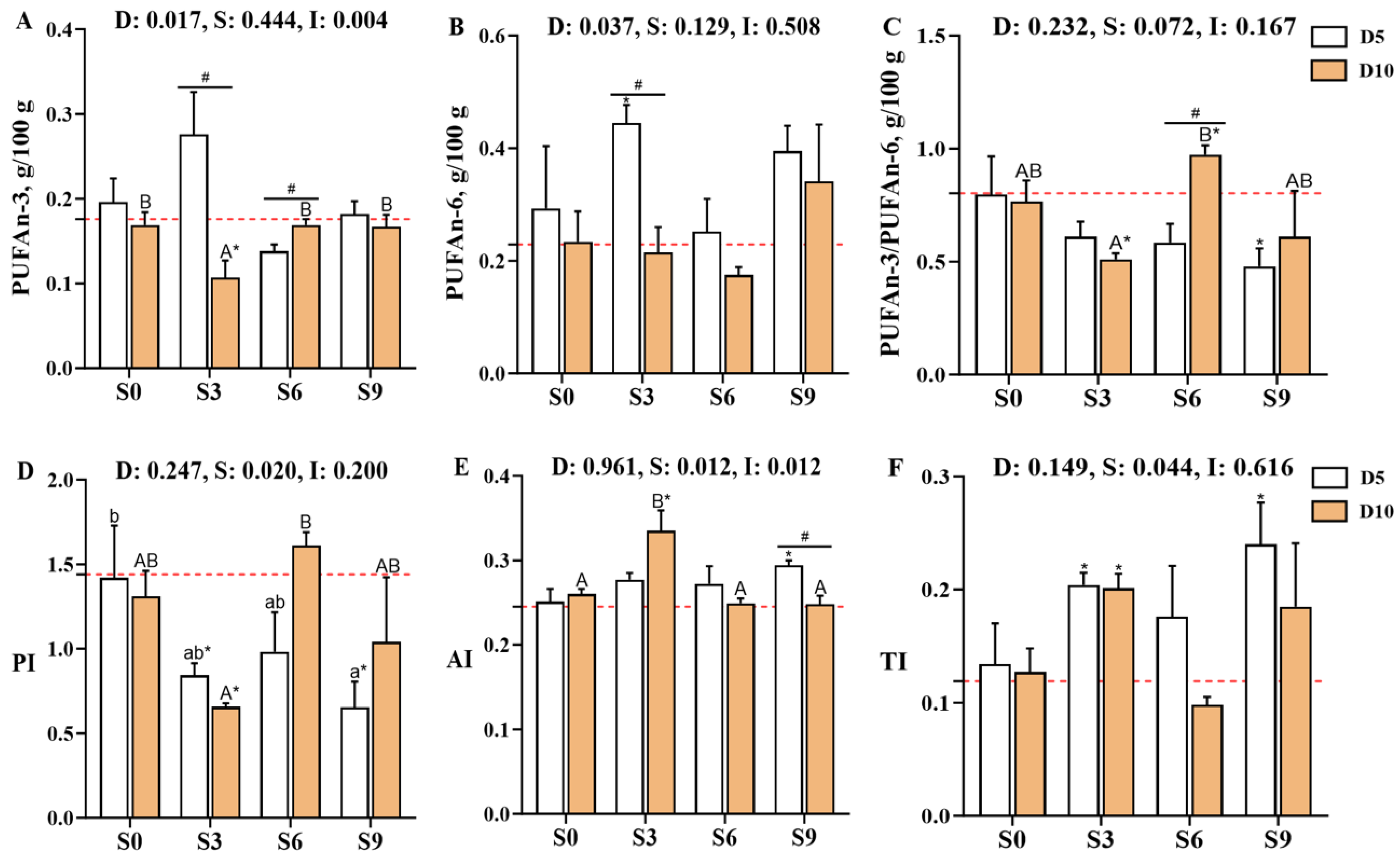 Effects of short-term depuration under saline conditions on muscle fatty acid nutritional evaluation in Carassius auratus gibelio. (A), Total content of n-3 polyunsaturated fatty acids (PUFAn-3) in muscle; (B), Total content of n-6 polyunsaturated fatty acids (PUFAn-6) in muscle; (C), The PUFAn-3/PUFAn-6 ratio in muscle; (D), Peroxidizability index (PI) in muscle; (E), Atherogenic index (AI) in muscle; (F), Thrombogenic index (TI) in muscle. The red dashed line indicates the baseline values of muscle nutritional composition measured before depuration (D0S0 group). “*” denote significant differences between each depuration treatment group and the D0S0 group (independent samples t-test, p < 0.05). “#” denotes significant differences among groups subjected to different depuration durations under the same salinity conditions (Independent samples t-test, p < 0.05). Different lowercase superscript letters indicate significant differences among salinity groups (S0, S3, S6, and S9) after 5 days of depuration (D5) (Tukey’s test, p < 0.05), while different uppercase superscript letters indicate significant differences among salinity groups (S0, S3, S6, S9) after 10 days of depuration (D10) (Tukey’s test, p < 0.05).