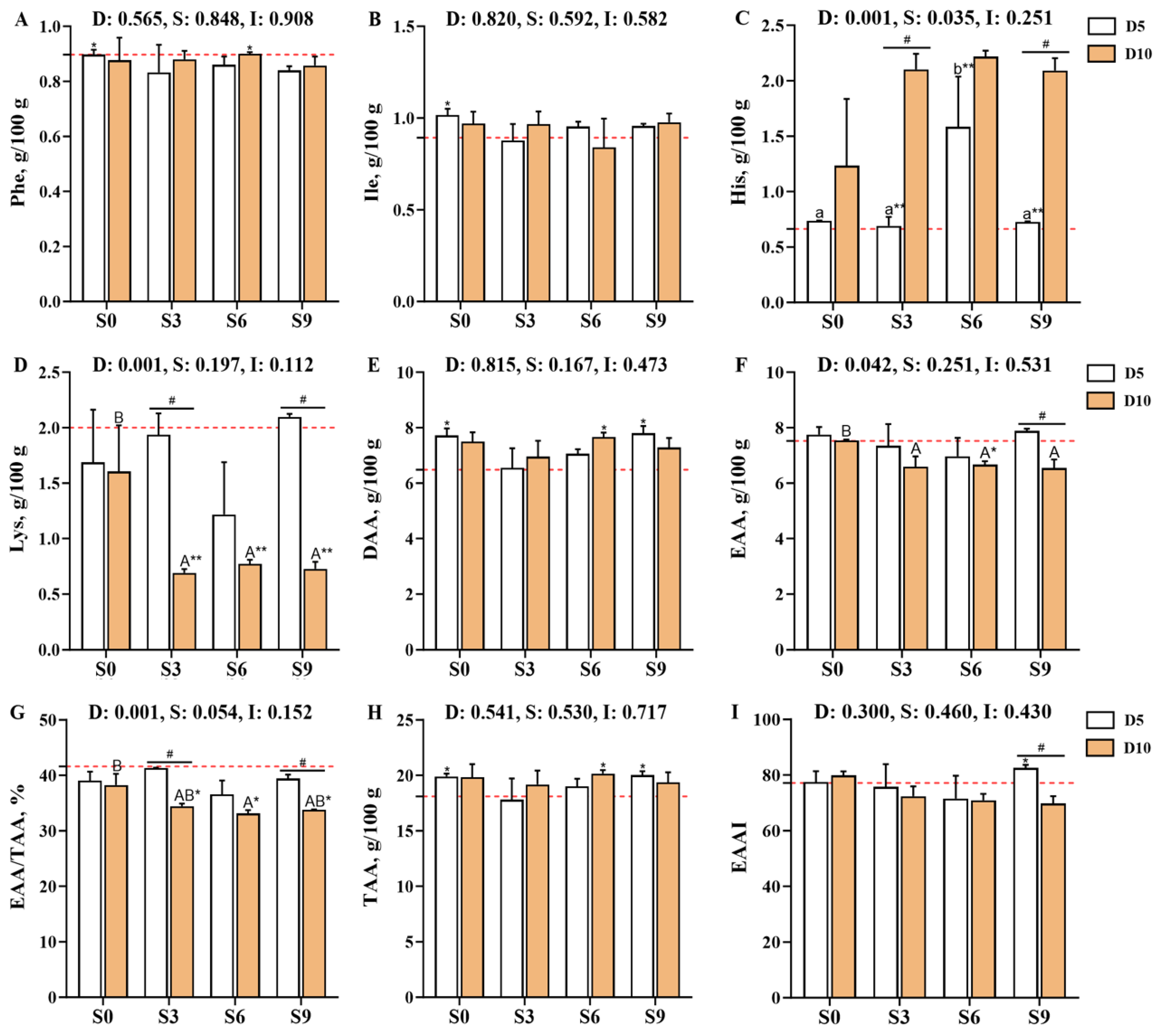 Effects of short-term depuration under saline conditions on muscle amino acid composition and essential amino acids in Carassius auratus gibelio. (A), Phenylalanine (Phe) content in muscle; (B), Isoleucine (Ile) content in muscle; (C), Histidine (His) content in muscle; (D), Lysine (Lys) content in muscle; (E), Total content of delicious amino acids (DAA) in muscle; (F), Total content of essential amino acids (EAA) in muscle; (G), The EAA/TAA ratio in muscle; (H), Total content of amino acid (TAA) in muscle; (I), Essential amino acid index (EAAI) in muscle. The red dashed line indicates the baseline values of muscle nutritional composition measured before depuration (D0S0 group). “*” and “**” denote significant and highly significant differences between each depuration treatment group and the D0S0 group (independent samples t-test, p < 0.05 and p < 0.01, respectively). “#” denotes significant differences among groups subjected to different depuration durations under the same salinity conditions (Independent samples t-test, p < 0.05). Different lowercase superscript letters indicate significant differences among salinity groups (S0, S3, S6, and S9) after 5 days of depuration (D5) (Tukey’s test, p < 0.05), while different uppercase superscript letters indicate significant differences among salinity groups (S0, S3, S6, S9) after 10 days of depuration (D10) (Tukey’s test, p < 0.05).