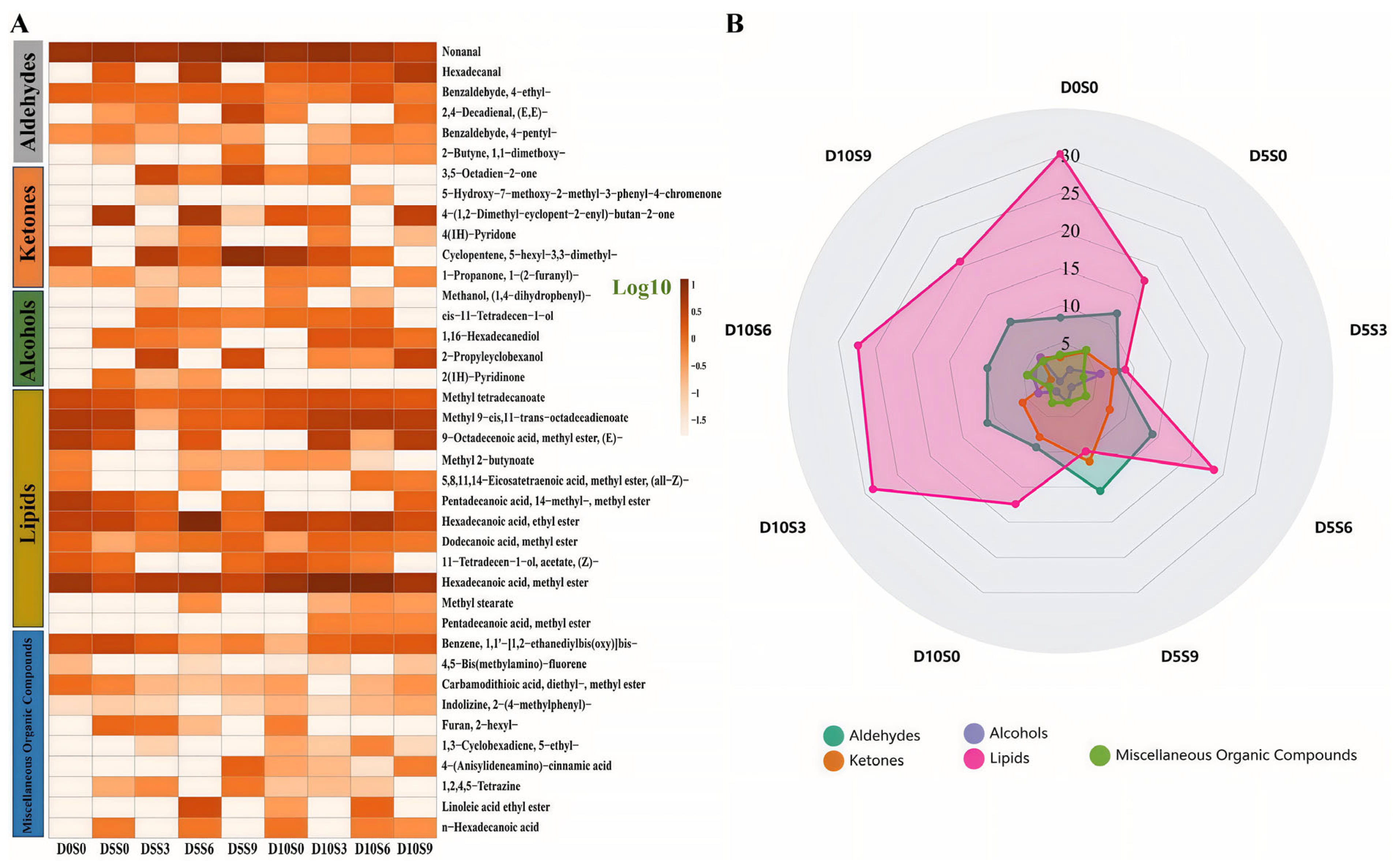 Effects of short-term depuration under saline conditions on the muscle content of volatile compounds in Carassius auratus gibelio. (A) the heatmap analysis of volatile compounds. The color gradient from light to dark represents the relative abundance of volatile compounds on a Log10 scale, with darker colors indicating higher concentrations. (B) the classification analysis of volatile compounds.