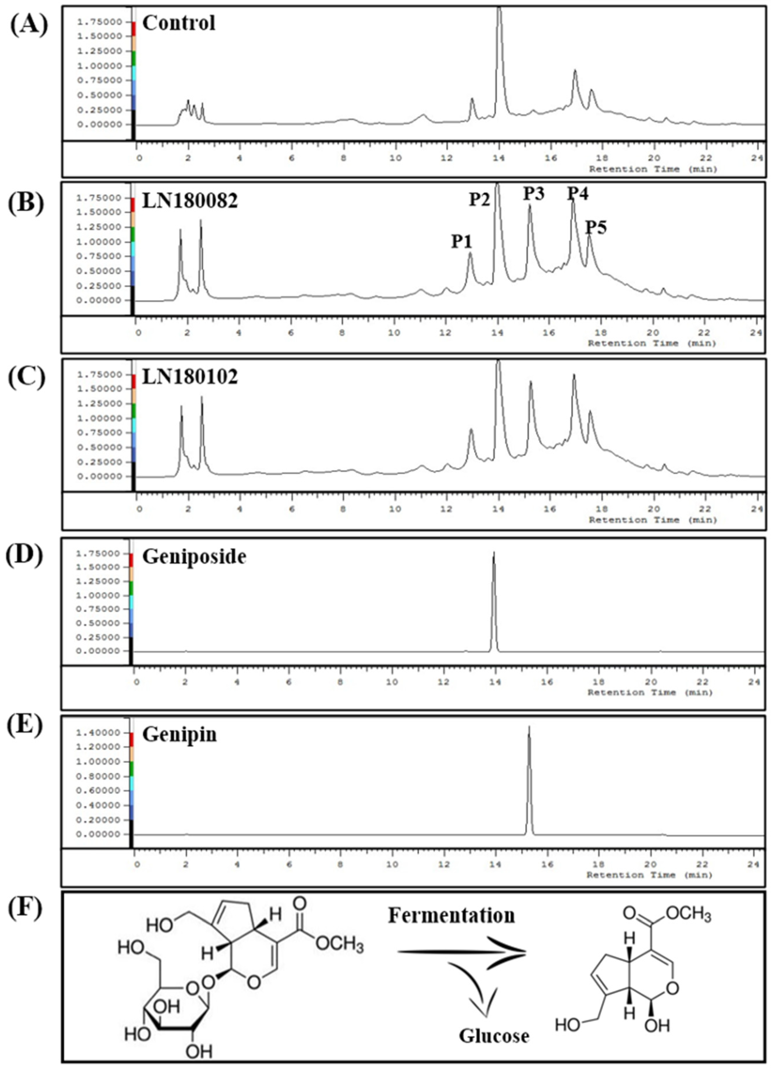 - Dong, Y.; Liu, L.; Bao, Y.; Hao, A.; Qin, Y.; Wen, Z.; Xiu, Z. Biotransformation of Geniposide in Gardenia jasminoides to Genipin by Trichoderma harzianum CGMCC 2979. Chin. J. Catal. 2014, 35, 1534–1546. [Google Scholar] [CrossRef]