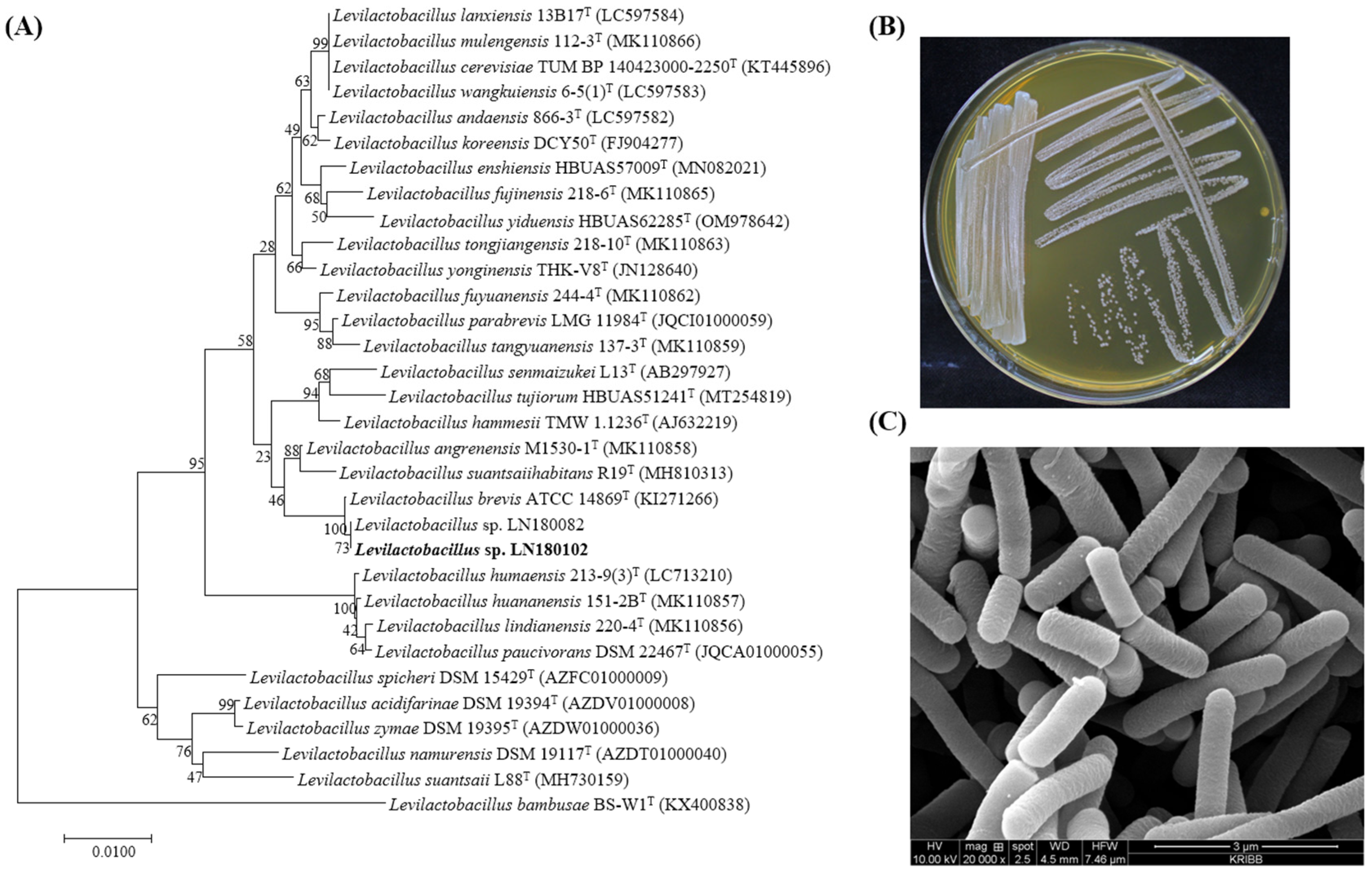 3.4. Phylogenetic and Morphological Analysis of Levilactobacillus sp. LN180102