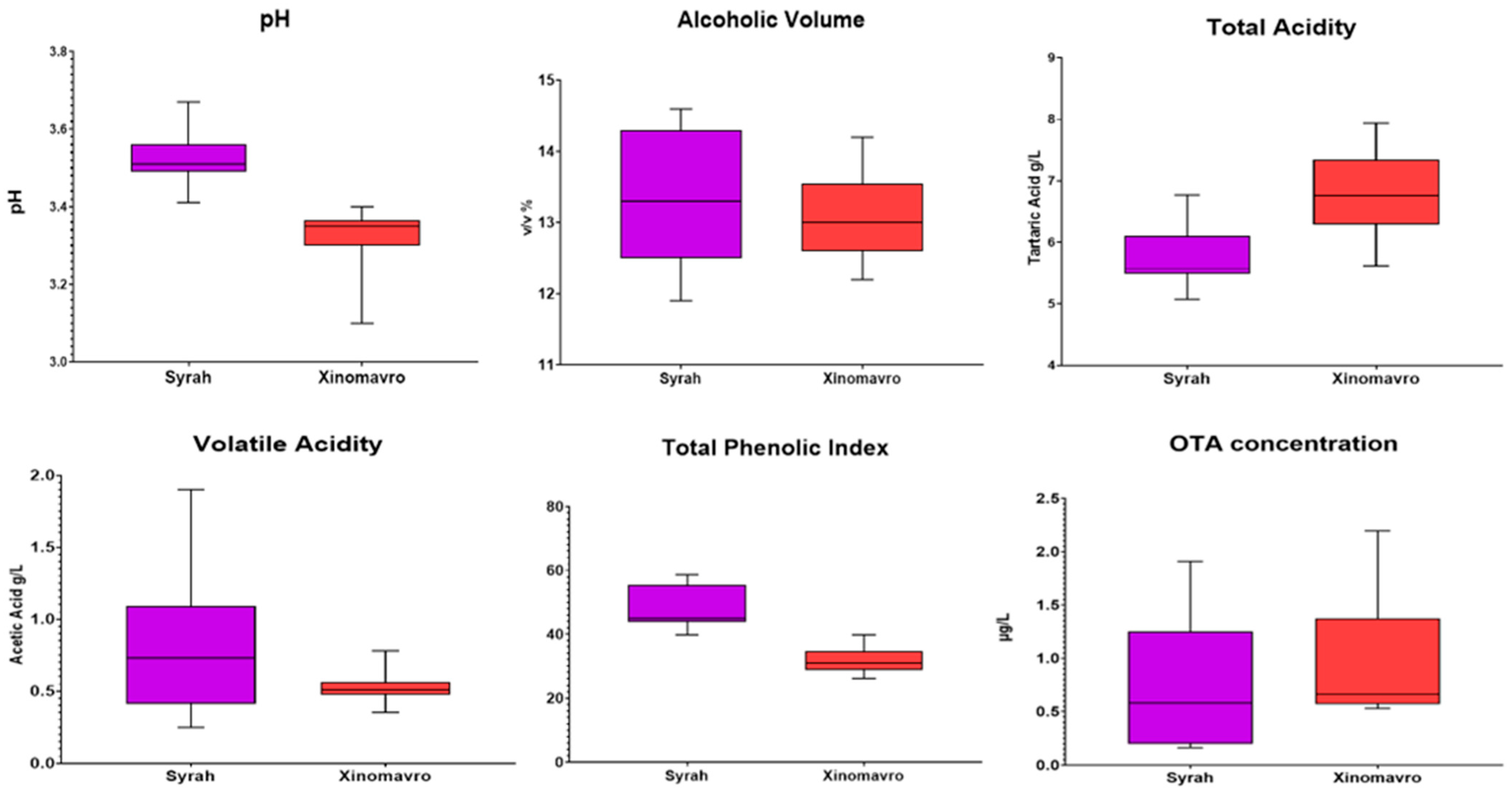The OTA concentrations in the red wine samples did not show significant differences between the two red varieties. However, no significant differences were observed in OTA concentration between the red grapevine varieties; Xinomavro presented slightly higher OTA concentration (0.91 μg/L) than the Syrah variety (0.81 μg/L).