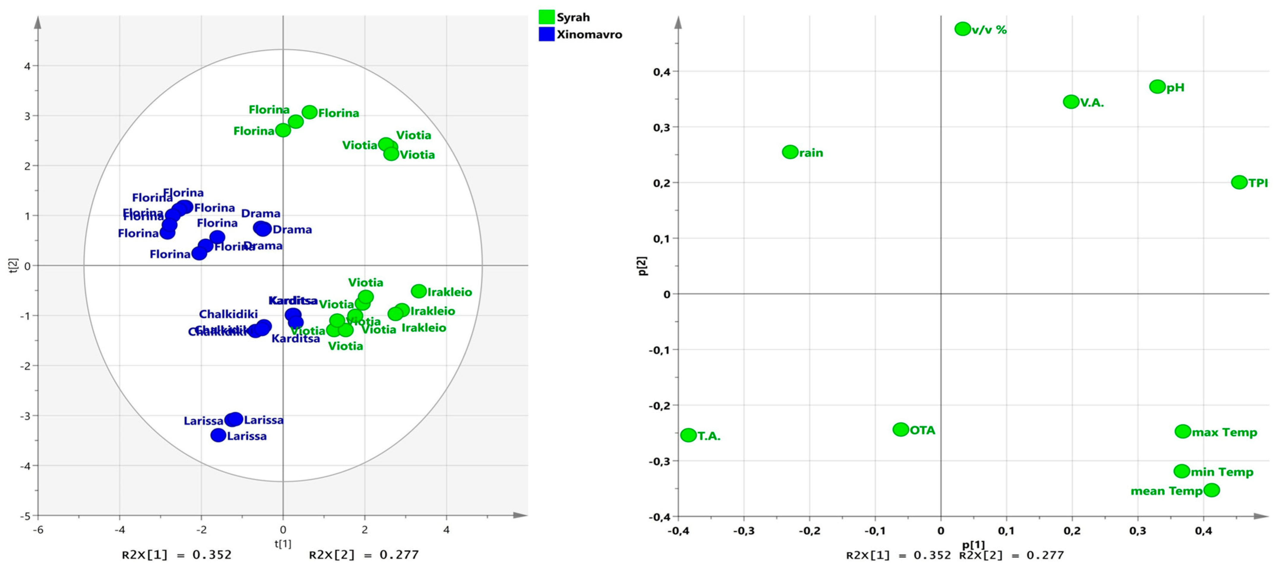 Figure 3. The principal component analysis (PCA) plot of scores (left) and correlation loadings (right) in the plane of the first two principal components for the red wine varieties Syrah and Xinomavro (T.A.: titratable acidity; V.A.: volatile acidity; TPI: total phenolic index; v/v%: alcoholic volume; OTA: ochratoxin A concentration; rain: Total rainfall.