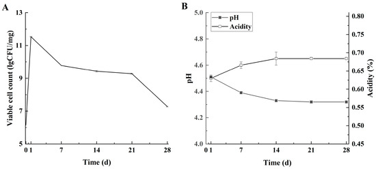 The fermentation characteristics of the Lg-sour cream during storage at 4 °C for 28 d. (A) Viable cell count, (B) pH and acidity. Viable counts were expressed as CFU/g. Values represent mean ± SD of replicate plates (n = 3).