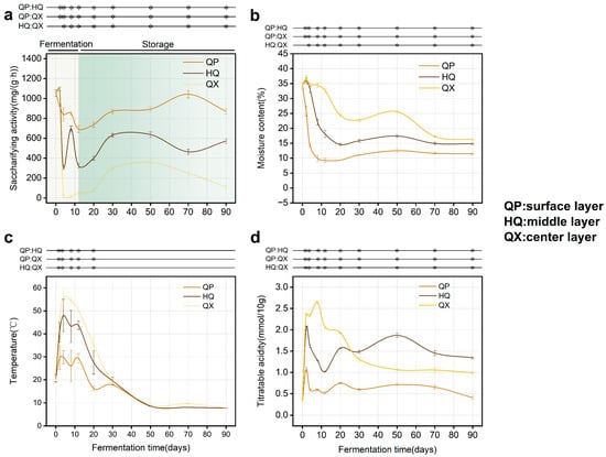 Saccharifying activity declined sharply across all Daqu layers after an initial peak (days 0–2, Figure 2a). Activity later recovered during storage (day 12 onward), stabilizing by day 30. This phase (12–30 d) defined a critical period for impacting final saccharifying activity. Saccharifying activity decreased from QP (highest) to QX (lowest) in a gradient, and this spatial divergence corresponded to microenvironmental gradients (p < 0.05). Moisture content decreased progressively across layers (QX > HQ > QP) (Figure 2b). Temperature initially peaked then declined, with QX consistently higher than QP and HQ (Figure 2c). Titratable acidity in QX exceeded that of QP and HQ during days 0–20, then declined (Figure 2d). Since saccharifying enzymes originate primarily from microbial metabolism [26], spatial variations in physicochemical properties may drive differential colonization by functional microbiota [27,28,29].