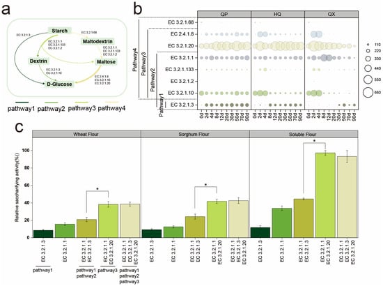 (a) Starch hydrolysis pathway. (b) The changes of saccharifying enzymes gene abundances (RPKM value) in strong-flavor Daqu. (c) The saccharifying activity of different saccharifying enzymes. * denotes significant differences (p < 0.05, one-way ANOVA, Tukey’s HSD test).