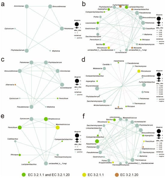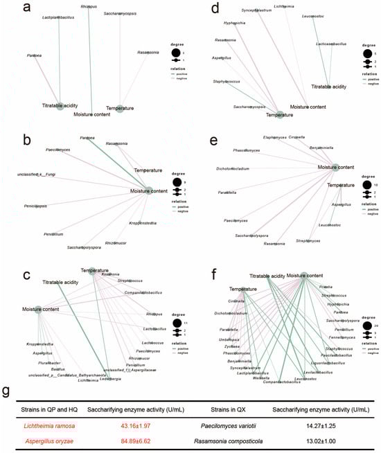 The correlation network analysis between EC 3.2.1.1 and EC 3.2.1.20 gene abundances and environmental factors in different microorganisms. (r > 0.7, p < 0.05), EC 3.2.1.1: (a) QP, (b) HQ, (c) QX; EC 3.2.1.20: (d) QP, (e) HQ, (f) QX. (g) Saccharifying enzyme activity of enzyme-producing functional microorganisms.