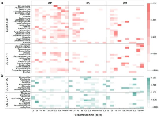 Distinct spatiotemporal dynamics characterized microbial contributors to key saccharifying enzymes across Daqu (Figure 4). For EC 3.2.1.1, bacterial genera Bacillus and Lactiplantibacillus dominated initial fermentation (0–4 d), shifting to fungal dominance post day 8. Lichtheimia and Aspergillus prevailed in QP and HQ layers, whereas QX exhibited mid-stage contributions from unclassified Fungi and Paecilomyces, shifting to Rasamsonia and Kroppenstedtia later (Figure 4a).