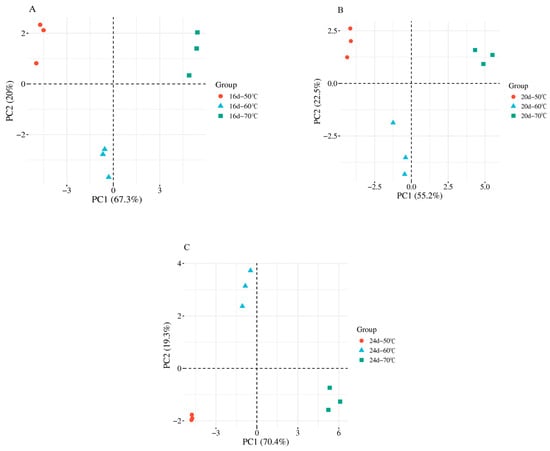 PCA was performed on the lipid oxidation products from the aforementioned temperature groups to simplify complex datasets while retaining the maximum amount of original information, thereby reflecting the inherent structure of the data [22]. The PCA score plots visually illustrate the differences among samples, as shown in Figure 3, where A–C represent samples collected on 16 d, 20 d, and 24 d, respectively.