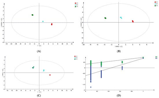 The OPLS-DA score plots of the sample groups. (A–C) represent the samples taken on 16 d, 20 d, and 24 d, respectively, and (D) represents the permutation test of the OPLS-DA model.