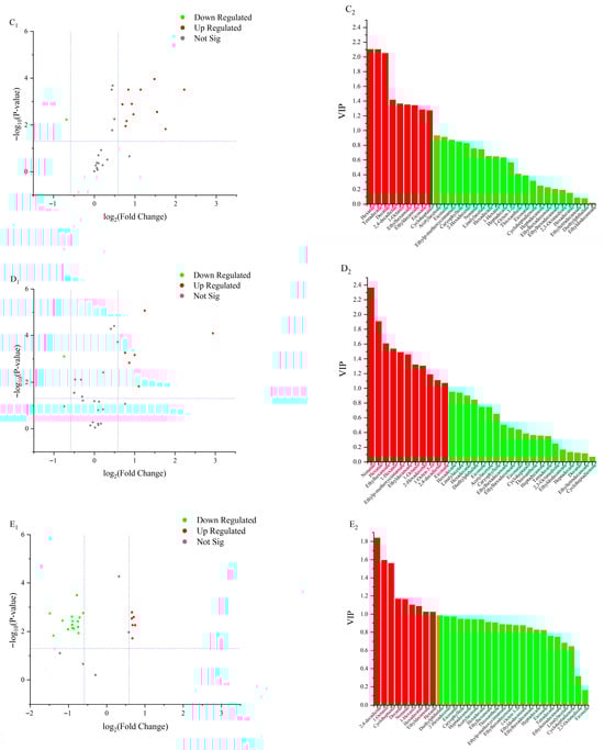 Volcano plots and VIP value plots of lipid oxidation products. (A1,A2) represents the comparison between samples at 50 °C and 60 °C on 16 d; (B1,B2) represents the comparison between samples at 60 °C and 70 °C on 16 d; (C1,C2) represents the comparison between samples at 50 °C and 60 °C on 20 d; (D1,D2) represents the comparison between samples at 60 °C and 70 °C on 20 d; (E1,E2) represents the comparison between samples at 50 °C and 60 °C on 24 d; (F1,F2) represents the comparison between samples at 60 °C and 70 °C on 24 d.