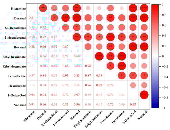 Heatmap of the correlation between lipid oxidation products and histamine content. Notes: ***, **, and * represent p ≤ 0.0001, p ≤ 0.01, and p ≤ 0.05, respectively.