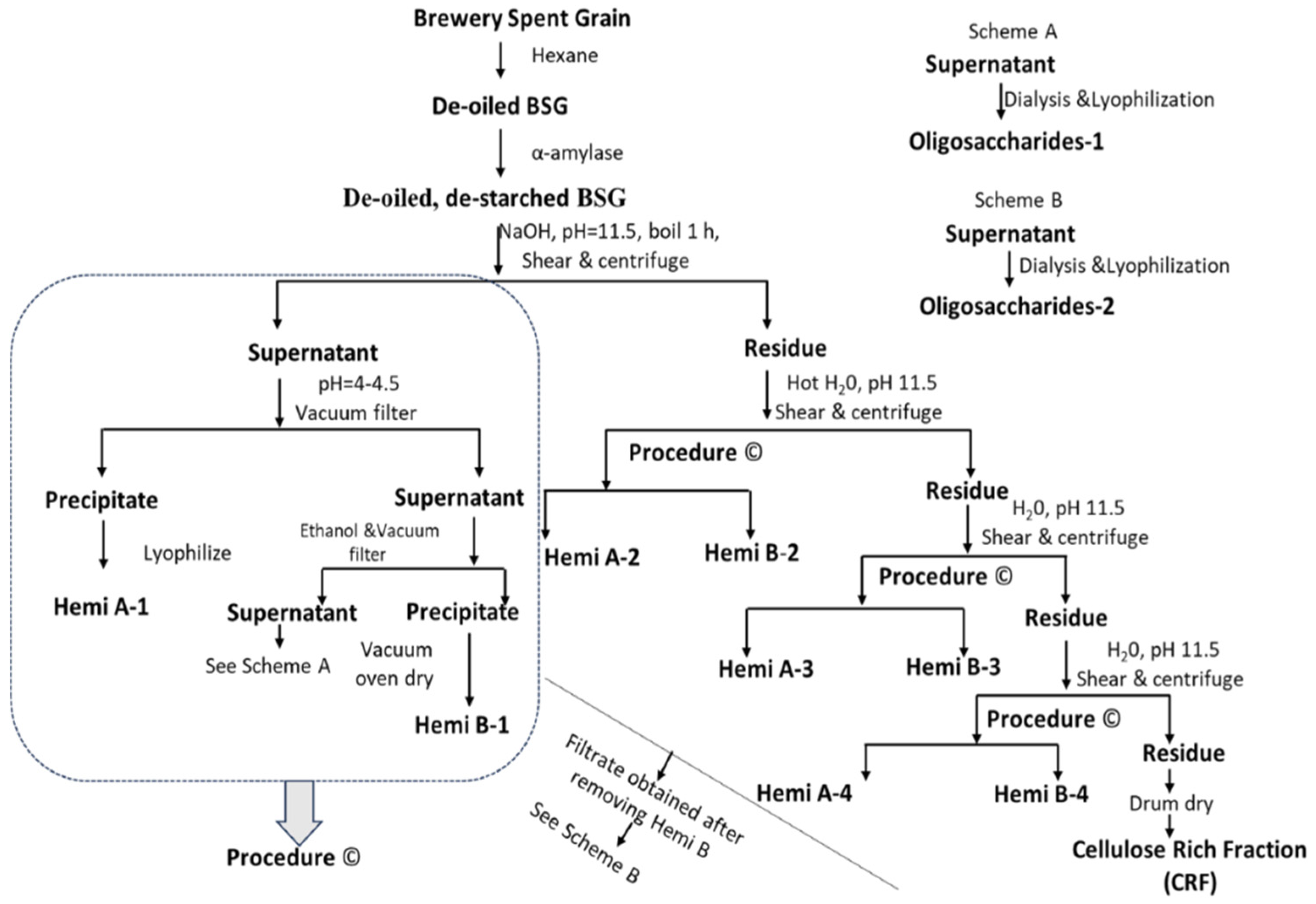 - Mainali, K.; Yadav, M.P.; Sharma, B.K.; Sarker, M.I.; Ngo, H.; Hotchkiss, A.; Simon, S. Isolation and Characterization of the Physiochemical Properties of Brewer’s Spent Grain. Agriculture 2024, 15, 47. [Google Scholar] [CrossRef]