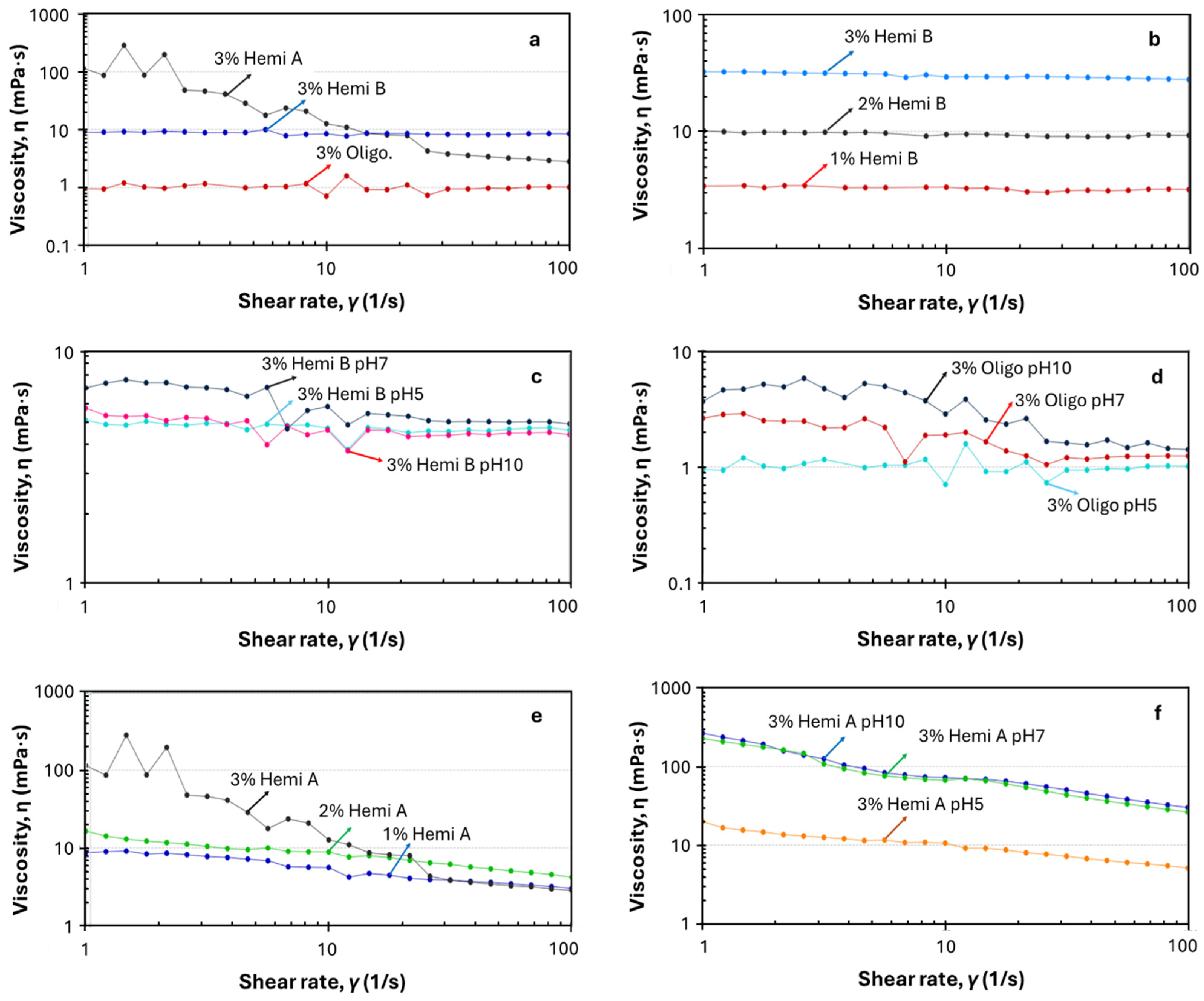 - Kale, M.S.; Yadav, M.P.; Hicks, K.B.; Hanah, K. Concentration and shear rate dependence of solution viscosity for arabinoxylans from different sources. Food Hydrocoll. 2015, 47, 178–183. [Google Scholar] [CrossRef]