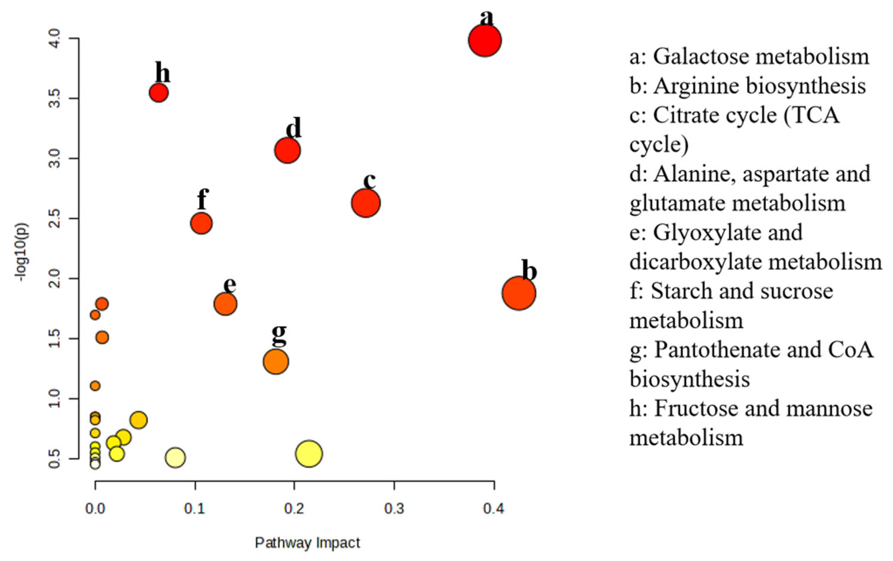 3.6. Differential Metabolite Screening and Metabolic Pathway Analysis