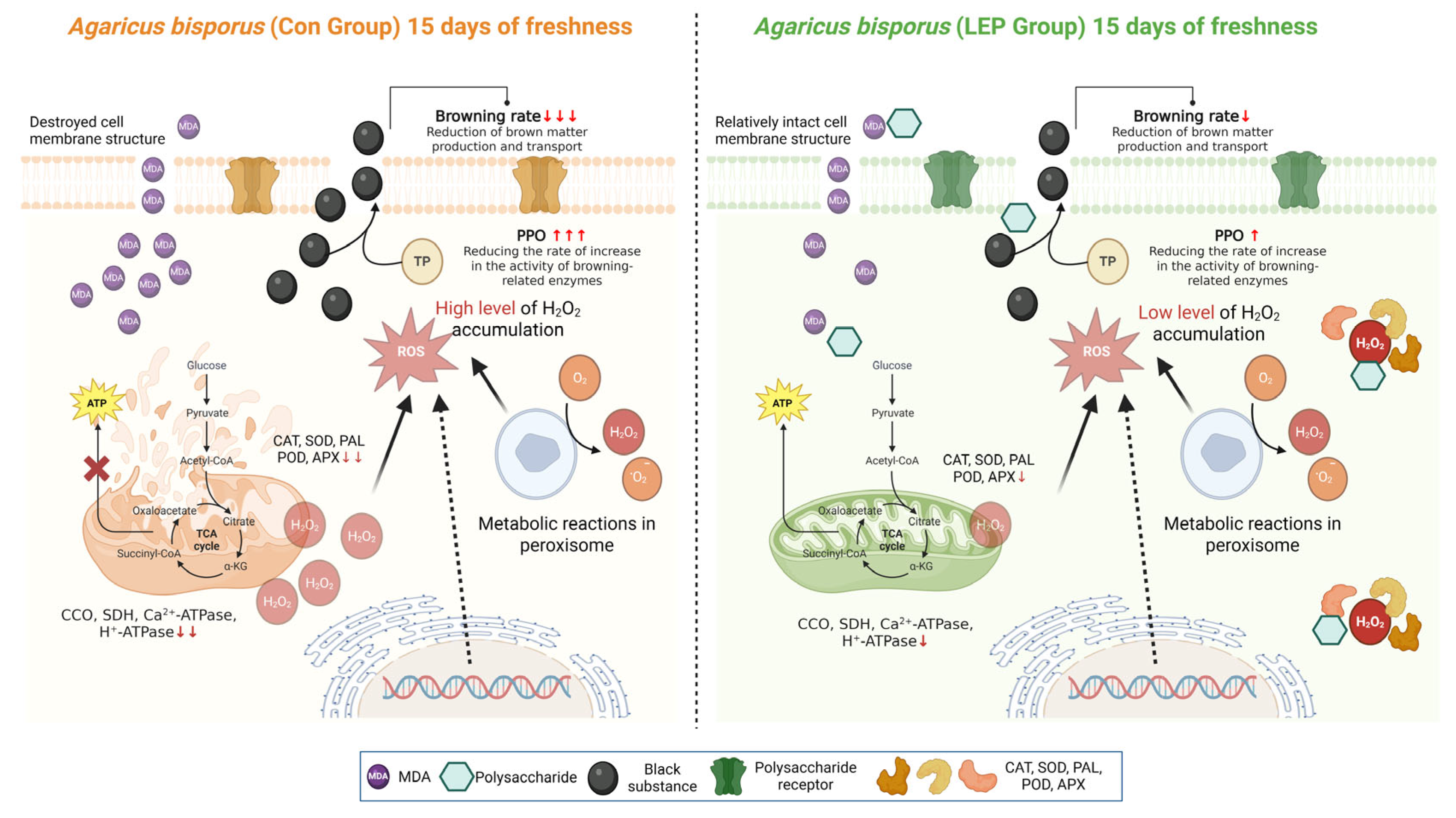 Yang, W.; Xia, T.; Miao, R.; Long, H.; Wang, J.; Li, N.; Zhao, Y.; Chen, F.; Guo, Y.; Gong, P. Lentinula edodes Stalk Polysaccharide Coating Extends the Shelf-Life of Agaricus bisporus by Modulating Respiration and Energy Metabolism. Foods 2025, 14, 4172. https://doi.org/10.3390/foods14244172