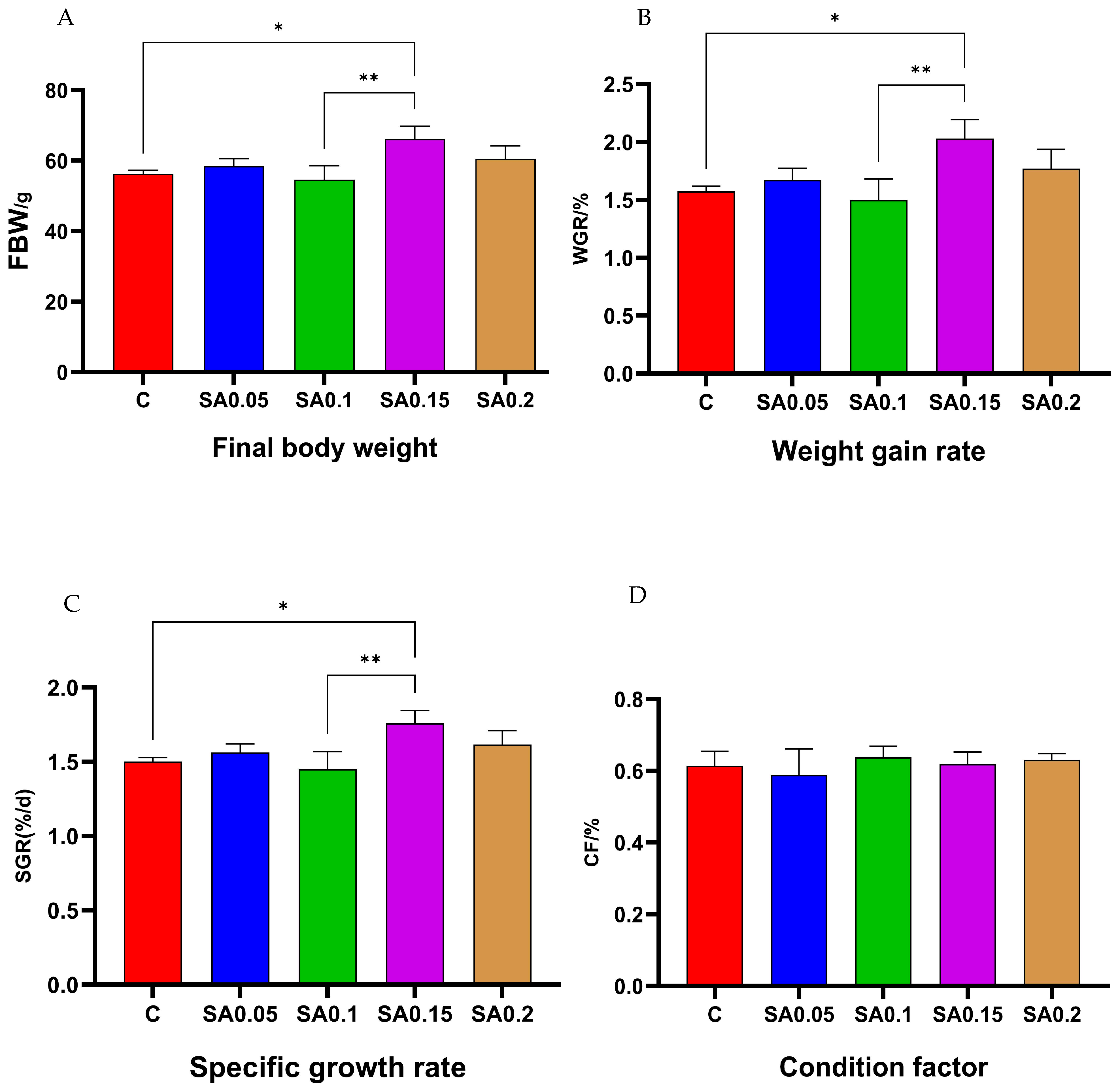 As shown in Figure 1, the growth performance of mud crabs varied significantly between the dietary treatments. Compared with the CG, crabs fed with 0.05%, 0.15%, and 0.2% SA extract supplements showed increased final body weight (FBW), weight gain rate (WGR), and specific growth rate (SGR). These increases were particularly observed in the 0.15% group, where these parameters were significantly higher (p < 0.05). These effects may be attributed to the bioactive compounds present in SA extract, including polysaccharides (known to enhance feed efficiency and nutrient absorption), saponins, and flavonoids. Supporting this observation, Wang et al. [17] demonstrated that similar plant-derived compounds, such as mulberry leaf flavonoids and polysaccharides, significantly boosted growth performance in largemouth bass (Micropterus salmoides). The Complexed Oral Liquid of Spartina (Wei-Shi-Jian-Zi-1997-N.321), prepared using Spartina extracts as raw material, increases the phagocytosis of macrophages and strengthens nonspecific immunity. Further animal and human tests have shown that Spartina extracts reduce uric acid levels and confer significant protective effects against gout [13]. Notably, the 0.1% supplementation group exhibited a marginal, statistically non-significant (p > 0.05) growth reduction. This phenomenon may have stemmed from either intrinsic growth rate variability among individual crabs or transient confounding factors (e.g., feeding activity fluctuations, molting phase synchronization, or microenvironmental variations), rather than reflecting genuine biological responses to SA extract. No significant differences (p > 0.05) were detected in the CF between the CG and all treatment groups. Although significant growth enhancement was observed at 0.15% and 0.2% supplementation levels, the consistent CF values across groups indicate that SA extract specifically promoted body weight gain without body conformation.