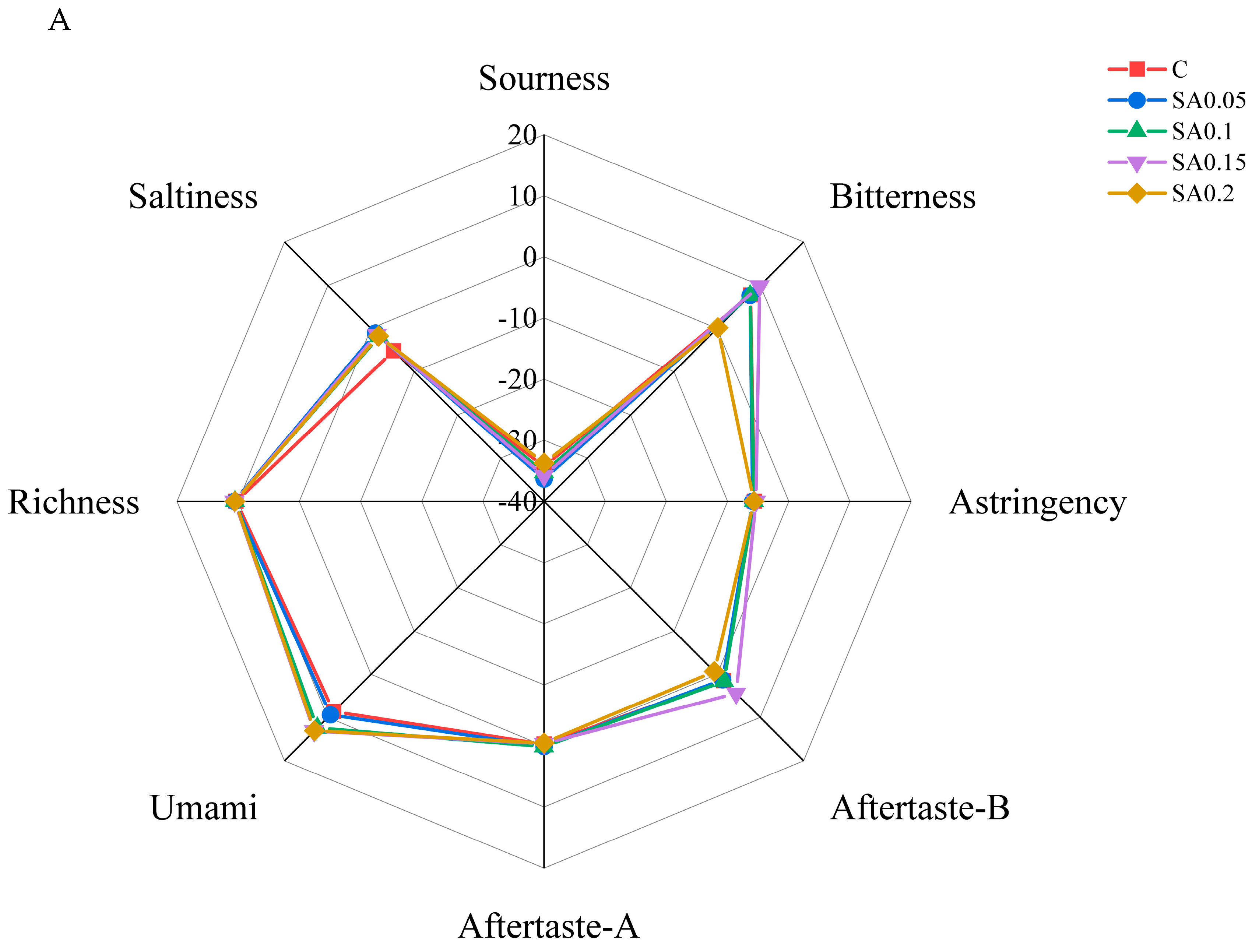 The electronic tongue radar plot (Figure 2A) revealed distinct differences between the groups, particularly in bitterness, bitter aftertaste, umami, and saltiness. Specifically, the 0.2% group exhibited lower bitterness and bitter aftertaste intensity values than the CG, while the umami intensity of the 0.1%, 0.15%, and 0.2% groups was significantly higher than that of the control. Additionally, the CG displayed lower saltiness than the other groups.