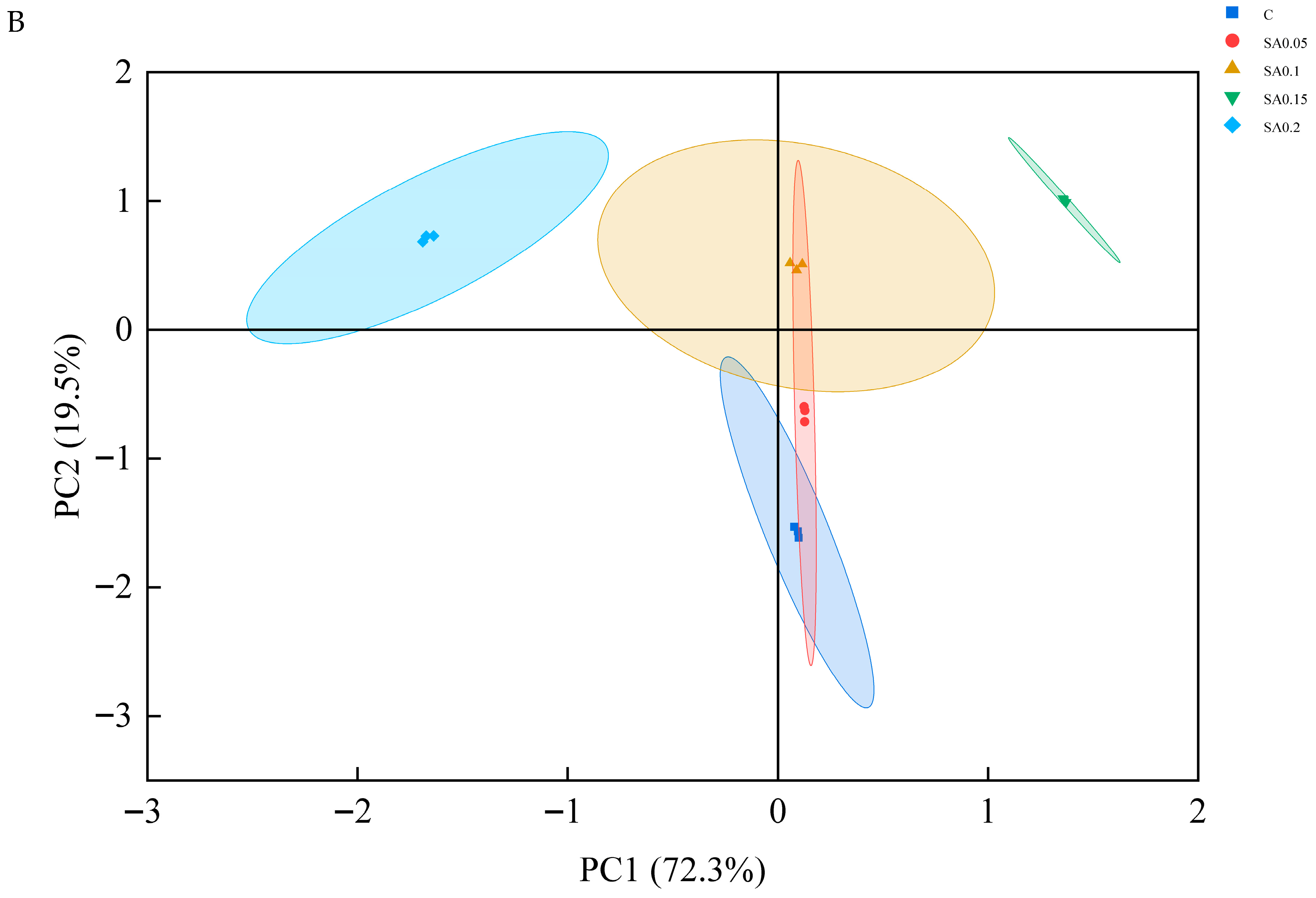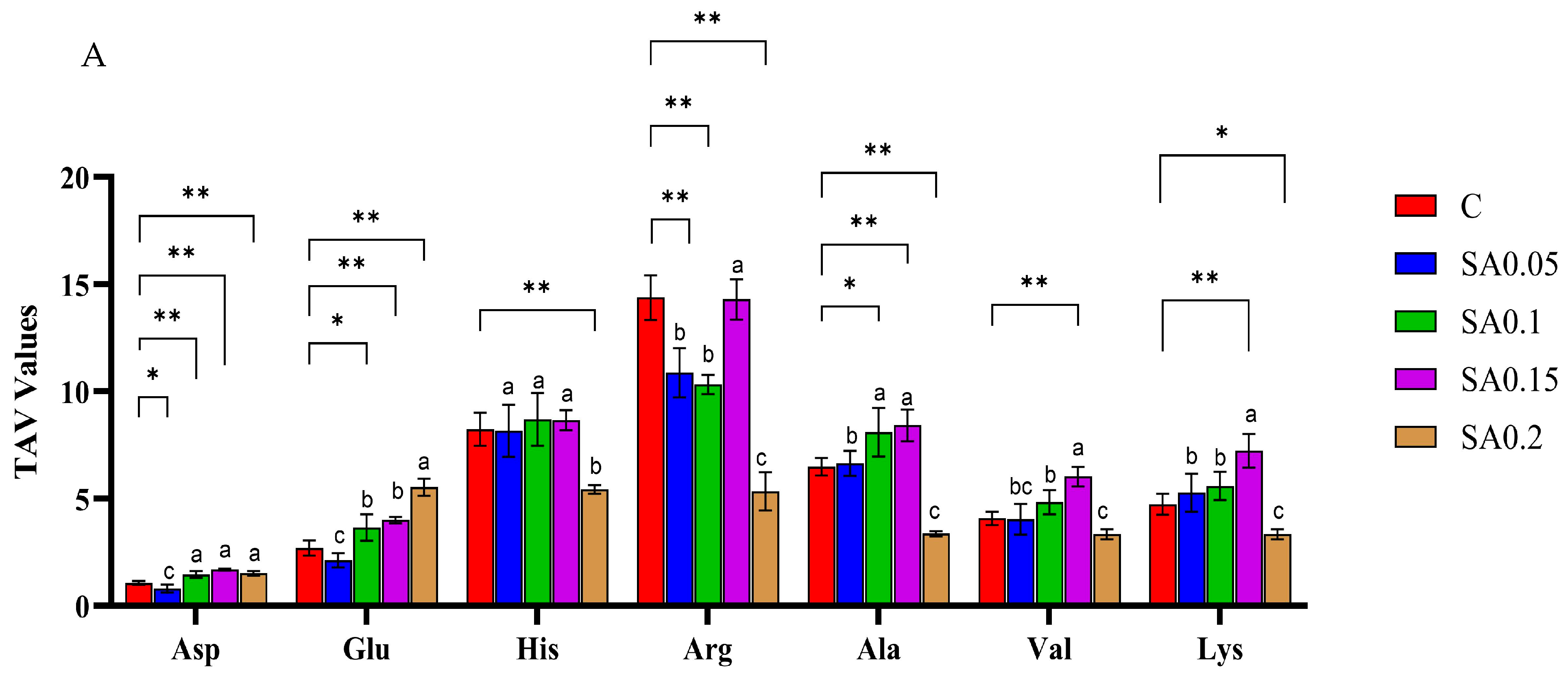 The taste activity value (TAV), defined as the ratio of the concentration of a taste-active substance to its taste threshold, serves as a key indicator of its flavor contribution. A TAV ≥ 1 signifies that the substance significantly influences the overall taste profile, with higher values indicating greater contribution [25]. Our analysis identified 7 key taste-active amino acids (Figure 3B). With the exception of Asp in the 0.05% group (TAV < 1), all examined free amino acids (Arg, His, Ala, Lys, Val, Glu, and Asp) exhibited TAV values ≥ 1 across treatment groups, directly impacting crab muscle flavor characteristics. Notably, the 0.1%, 0.15%, and 0.2% groups showed significantly higher TAV values for Asp and Glu than the CG (p < 0.05). As the primary umami amino acids, Asp and Glu synergize with flavor nucleotides to enhance umami perception—a key factor contributing to the distinctive, high-value flavor profile of mud crab [26]. Further analysis revealed that the 0.15% and 0.1% groups exhibited significantly higher TAV values for Ala compared with the control group (p < 0.01). As a sweet-tasting amino acid with subtle bitter undertones, Ala demonstrates pronounced flavor-enhancing synergy when combined with umami compounds such as glutamate and inosine monophosphate. Notably, the 0.15% group showed significantly elevated TAV values for 2 bitter-tasting amino acids Lys and Val relative to all other groups (p < 0.05), which corresponded to its stronger bitter profile in electronic nose analysis. In contrast, the 0.2% supplementation group displayed a fundamentally different pattern, with significantly reduced TAVs for 7 free amino acids (p < 0.05). Most notably, the decreased levels of bitter-tasting amino acids—particularly histidine (His), Lys, and Val—were primarily responsible for the substantially weaker bitter attributes detected in this group. These findings suggest a concentration threshold effect, where higher SA extract supplementation (≥0.2%) may selectively suppress certain amino acid metabolic pathways while preserving umami characteristics.