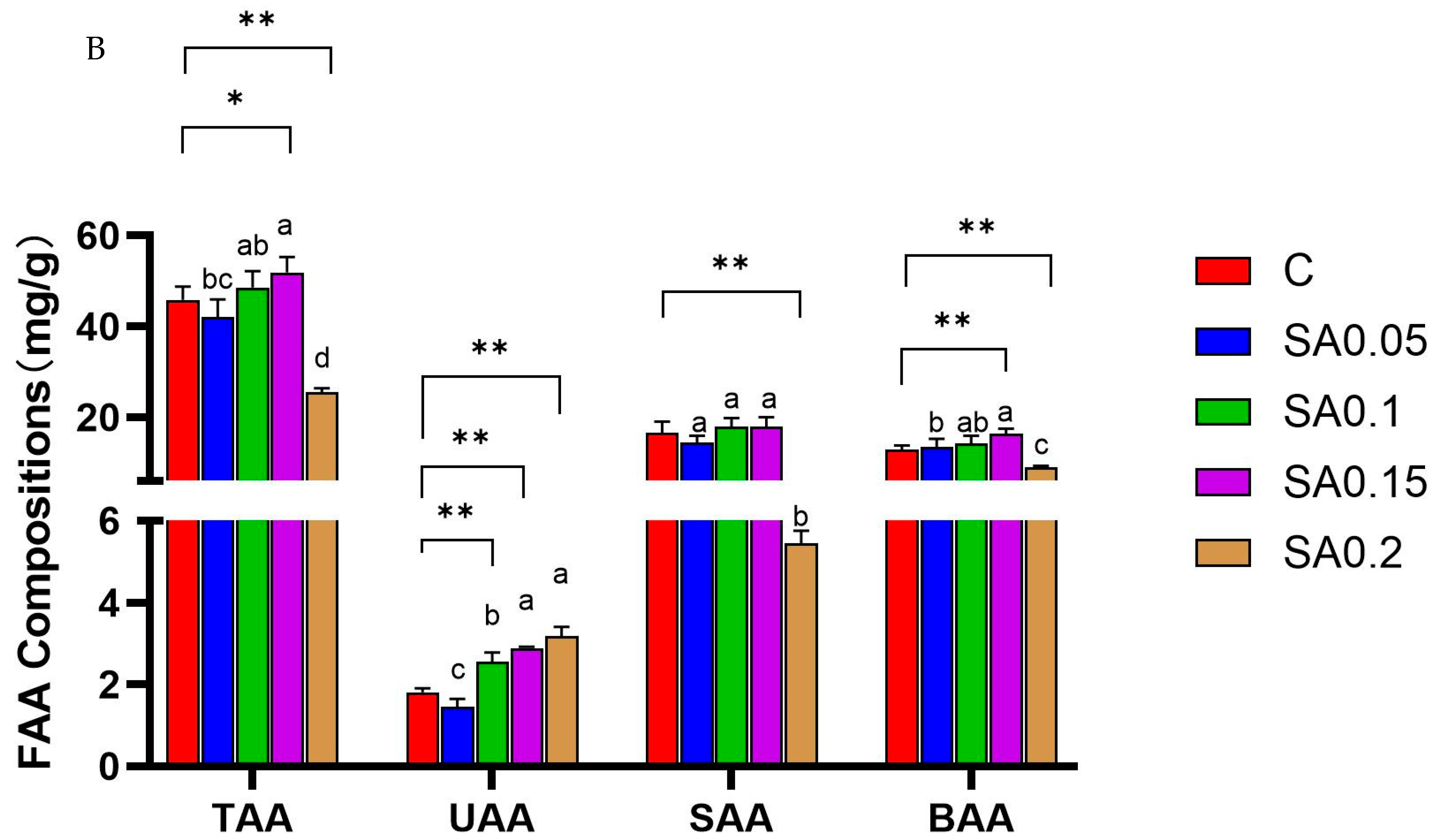 3.3. Effects of Different Concentrations of SA Extract on Free Amino Acids of Mud Crab