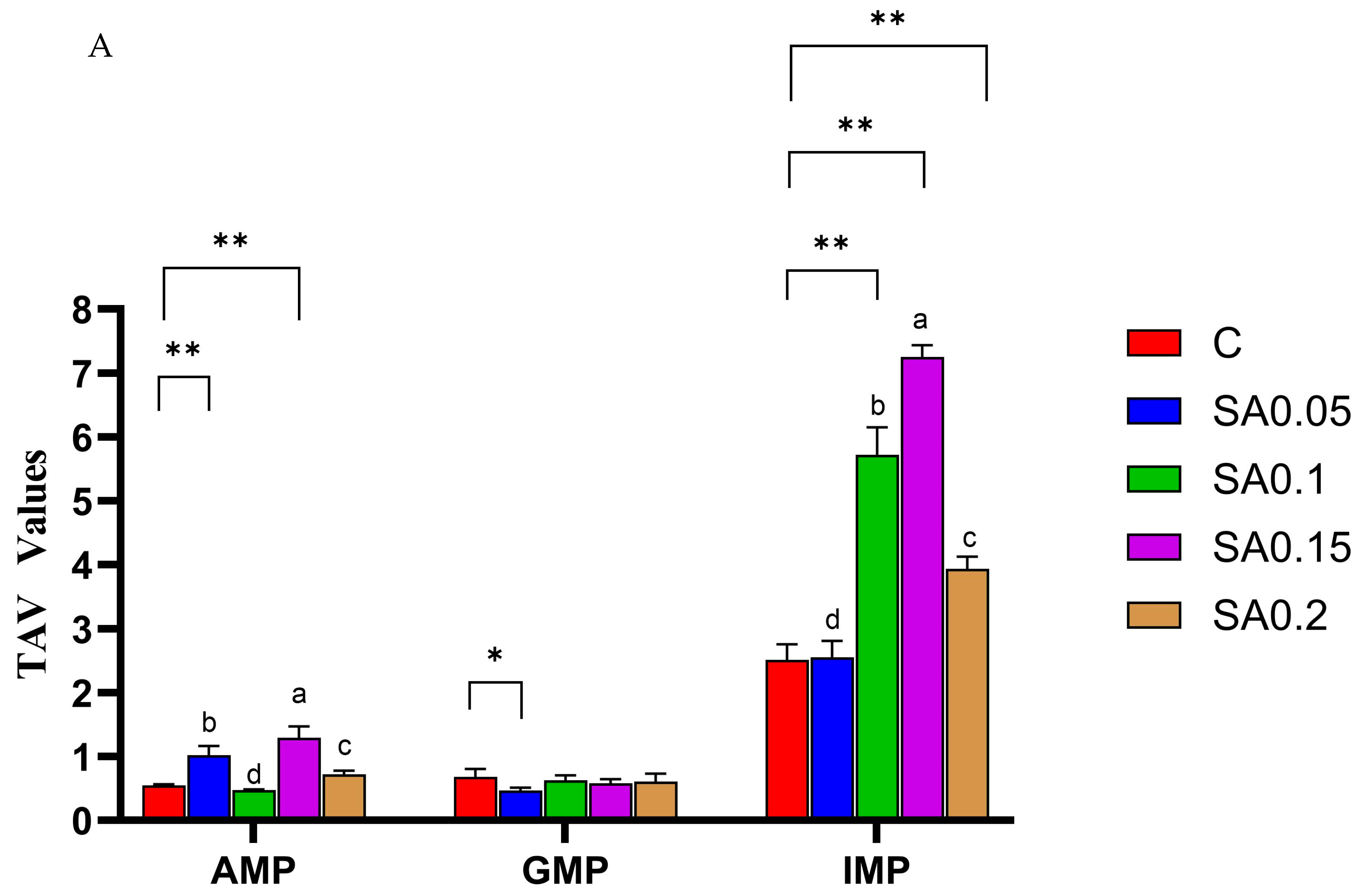 3.4. Effects of Different Concentrations of SA Extract on Flavor Nucleotides of Mud Crab