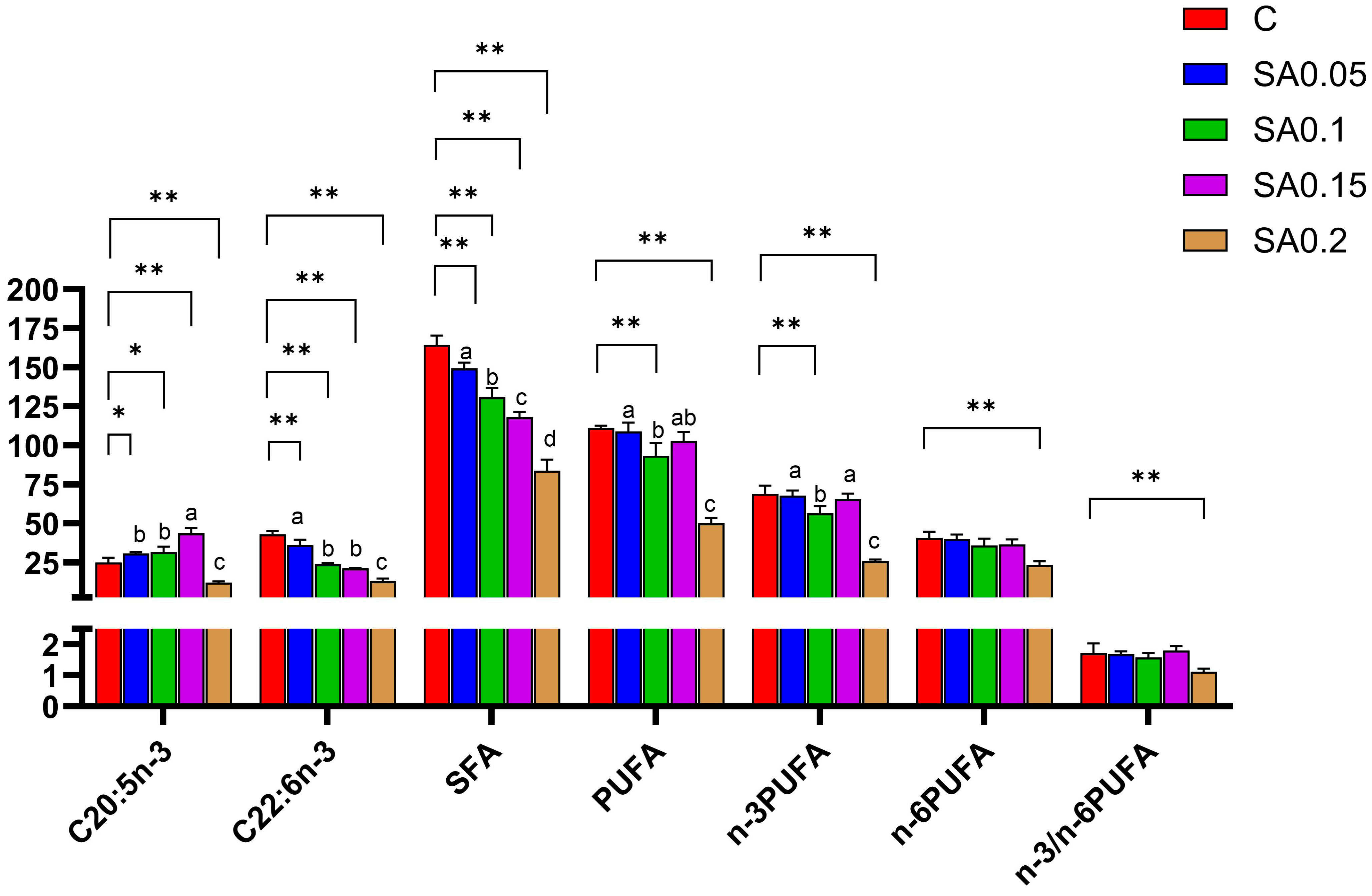 As shown in Table 3 and Figure 5, dietary supplementation with S. alterniflora extract significantly altered the fatty acid profile of mud crabs. A total of 37 fatty acids were identified, with saturated fatty acids (SFAs), primarily palmitic acid (C16:0) and tetracosanoic acid (C24:0), being the most abundant. The SFA content in the control group was significantly higher than in all treatment groups (p < 0.01), showing a dose-dependent decrease with increasing SA extract concentrations. This reduction may result from the inhibitory effects of bioactive compounds in the extract, particularly flavonoids, on SFA biosynthesis [32]. Further analysis indicated that palmitic acid levels in the CG were significantly higher than in other groups (p < 0.05), whereas tetracosanoic acid levels were elevated in both the CG and the 0.05% supplementation group relative to higher-dose treatments. Notably, excessive dietary SFA intake is strongly linked to cardiovascular disease risk. Palmitic acid, as a predominant dietary SFA, promotes arterial cholesterol deposition, thereby increasing atherosclerosis risk [33]. These findings suggest that SA extract supplementation can modulate SFA levels in mud crabs, potentially enhancing their nutritional value by mitigating health risks associated with high SFA consumption.