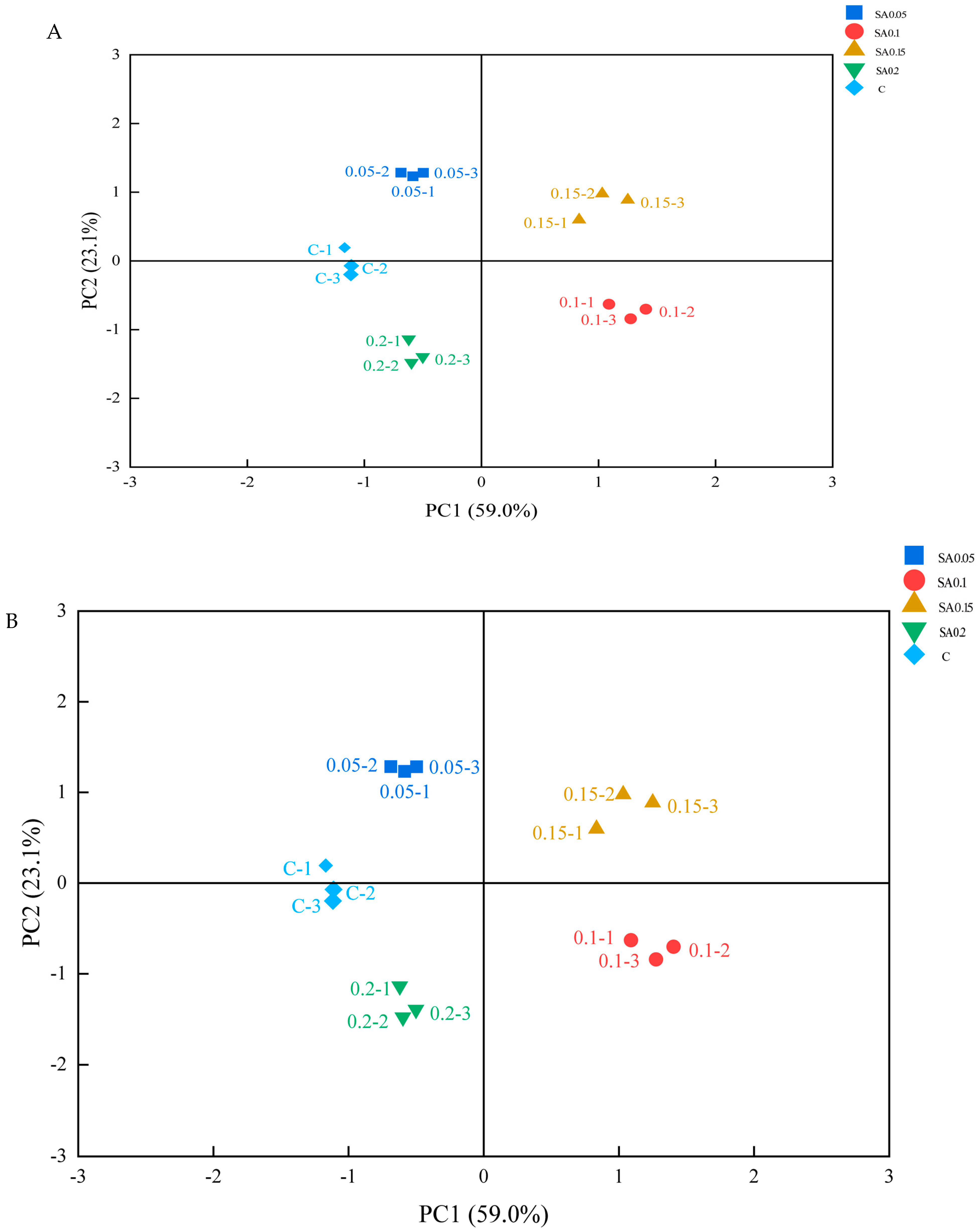 PCA of electronic nose data (Figure 6B) showed that the first two principal components (PC1 and PC2) explained 97.7% of the total variance, exceeding the 95% threshold required for effective odor characterization. Clear clustering patterns with no overlap between treatment groups indicated that SA extract supplementation significantly altered the volatile compound profile of crab meat. The most pronounced difference was observed between the CG and both the 0.1% and 0.15% treatment groups, suggesting that these concentrations had the greatest impact on the volatile compound profile of crab meat. Although the CG also showed distinct distributions from the 0.05% and 0.2% groups, these differences were primarily along PC2, which accounted for only 22.9% of total variance. This indicates that differences between the control and 0.1%/0.15% groups were more significant than those between the control and 0.05%/0.2% groups.