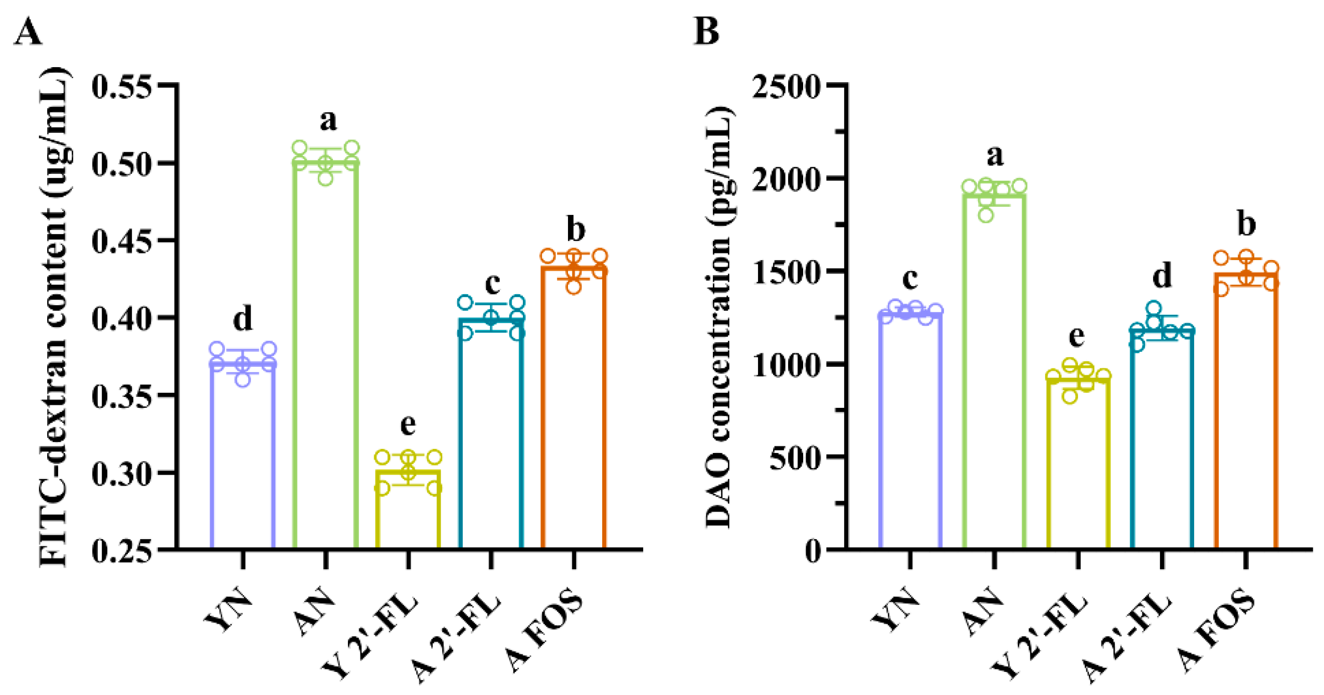 3.3. Effects of 2′-FL on Intestinal Permeability in Mice of Each Group