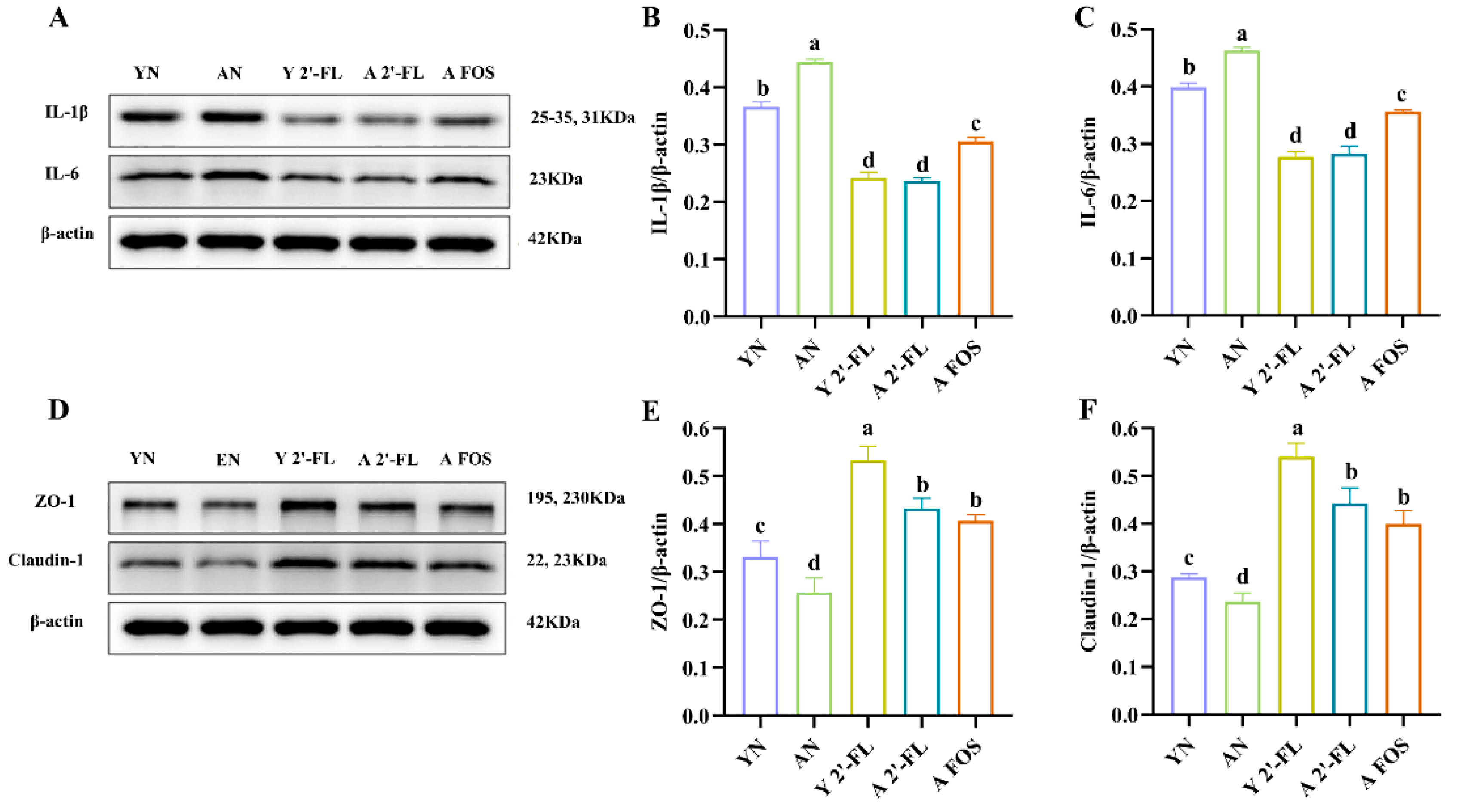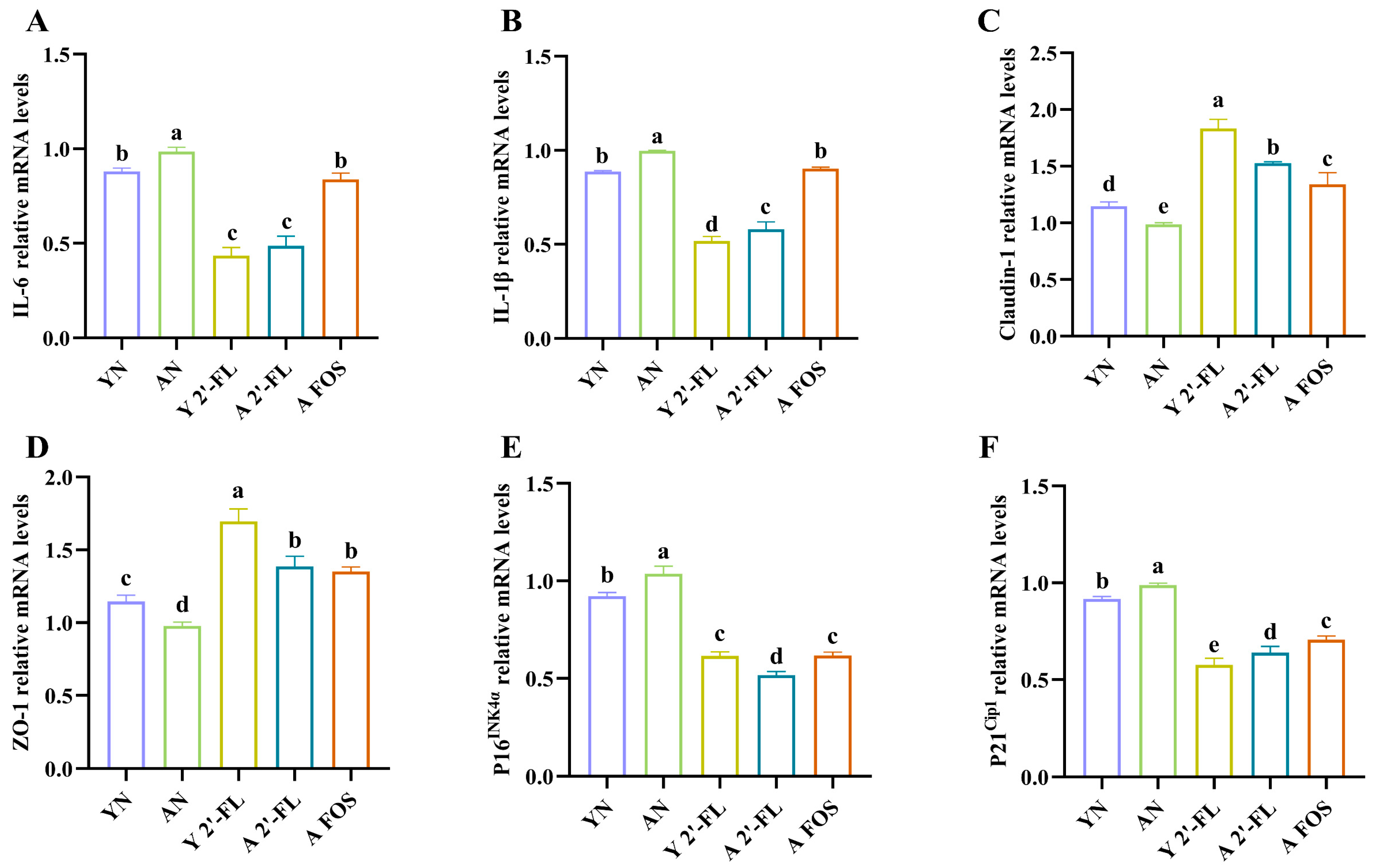 3.8. Effects of 2′-FL on the Expression of Intestinal-Related Inflammatory Factors and Tight Junction Proteins in Mice
