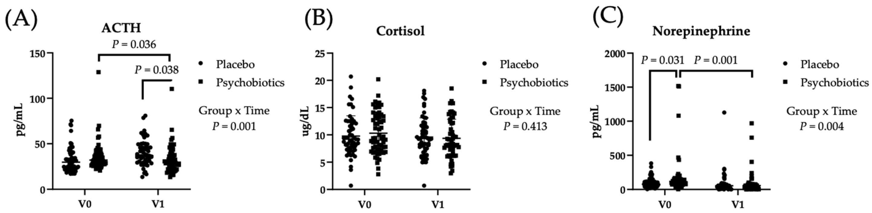 3.3. Effects of Psychobiotic Supplementation on Stress-Associated Blood Biomarkers