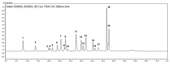 HPLC-DAD chromatogram of standard compounds (100 µg/mL) at 280 nm (1—gallic acid; 2—protocatechuic acid; 3—esculin; 4—catechin; 5—dihydrocaffeic acid; 6—chlorogenic acid; 7—caffeic acid; 8—epicatechin; 9—syringic acid; 10—phloretic acid; 11—p-coumaric acid; 12—ferulic acid; 13—synapic acid; 14—hesperetic acid; 15—naringin; 16—rutin; 17—trans-cinnamic acid; 18—quercetin; 19—naringenin).