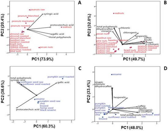 The biplot of PC1 and PC2 of HBAs and total phenolic content in nuts (A) and seeds (C); the biplot of PC1 and PC2 of HCAs and total phenolic content in nuts (B) and seeds (D).